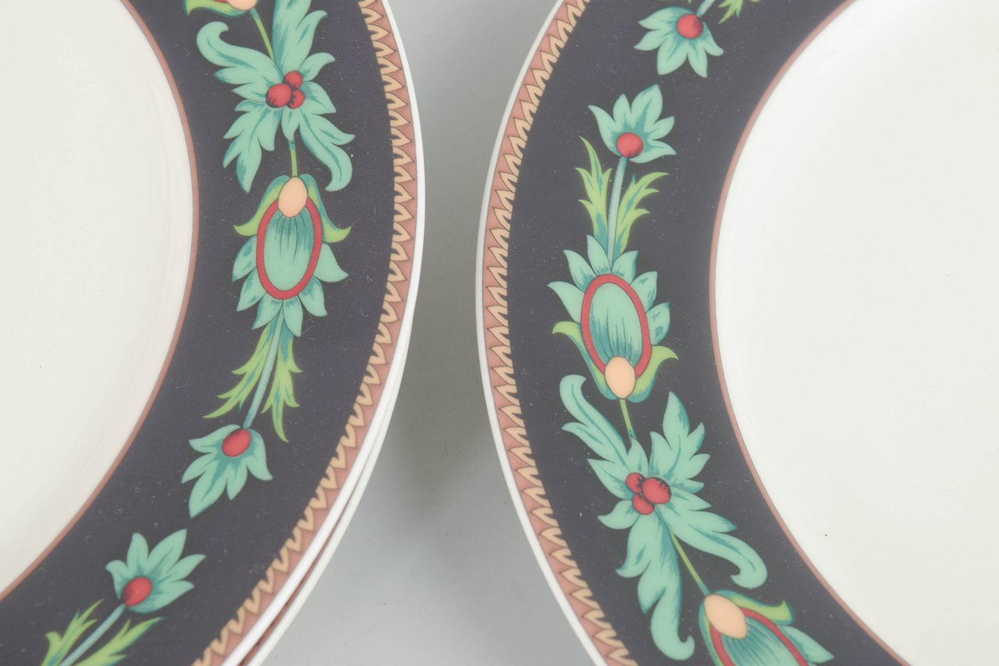 Set of three porcelain dinner plates with a decorative border in green and gilt tones against a dark ground. The plates were produced by Rosenthal after a design by Nina Campbell. Each plate measures 26 cm in diameter.