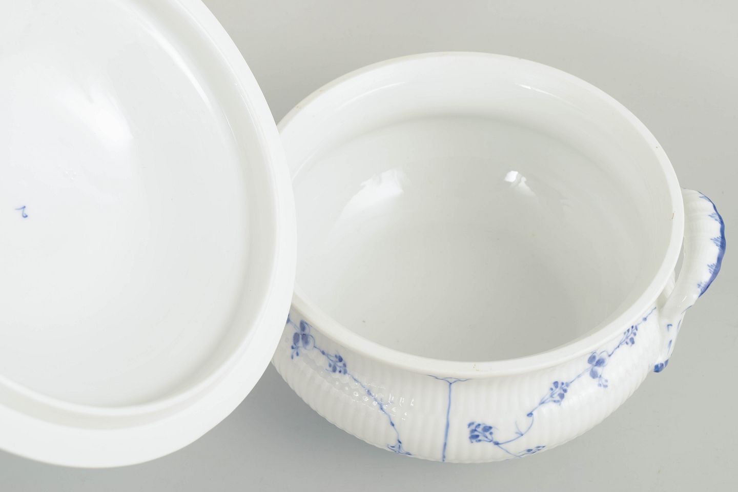 Large soup tureen with lid in hand-painted porcelain from the Blue Fluted Plain service with classic underglaze cobalt blue decoration and fluted surfaces. Model 1/222. H. 23 cm, D. 26 cm. First factory quality. Produced around 1900.