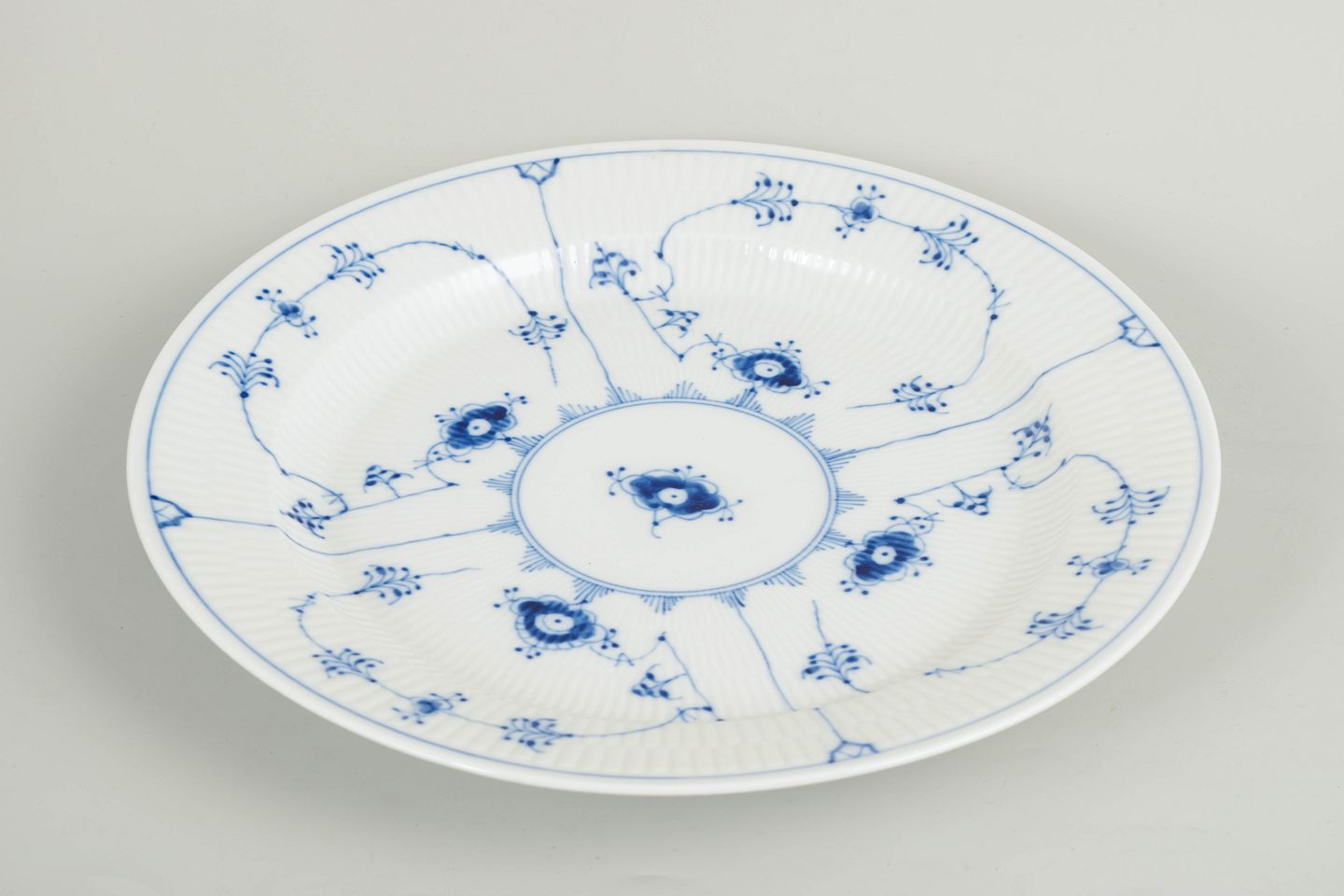 Large round platter in hand-painted porcelain from the Blue Fluted Plain service with classic underglaze cobalt blue decoration and fluted surfaces. Model 1/107. H. 4 cm, D. 33 cm. First factory quality. Produced in the 1980s.