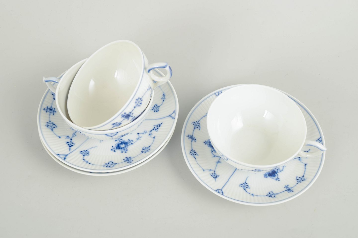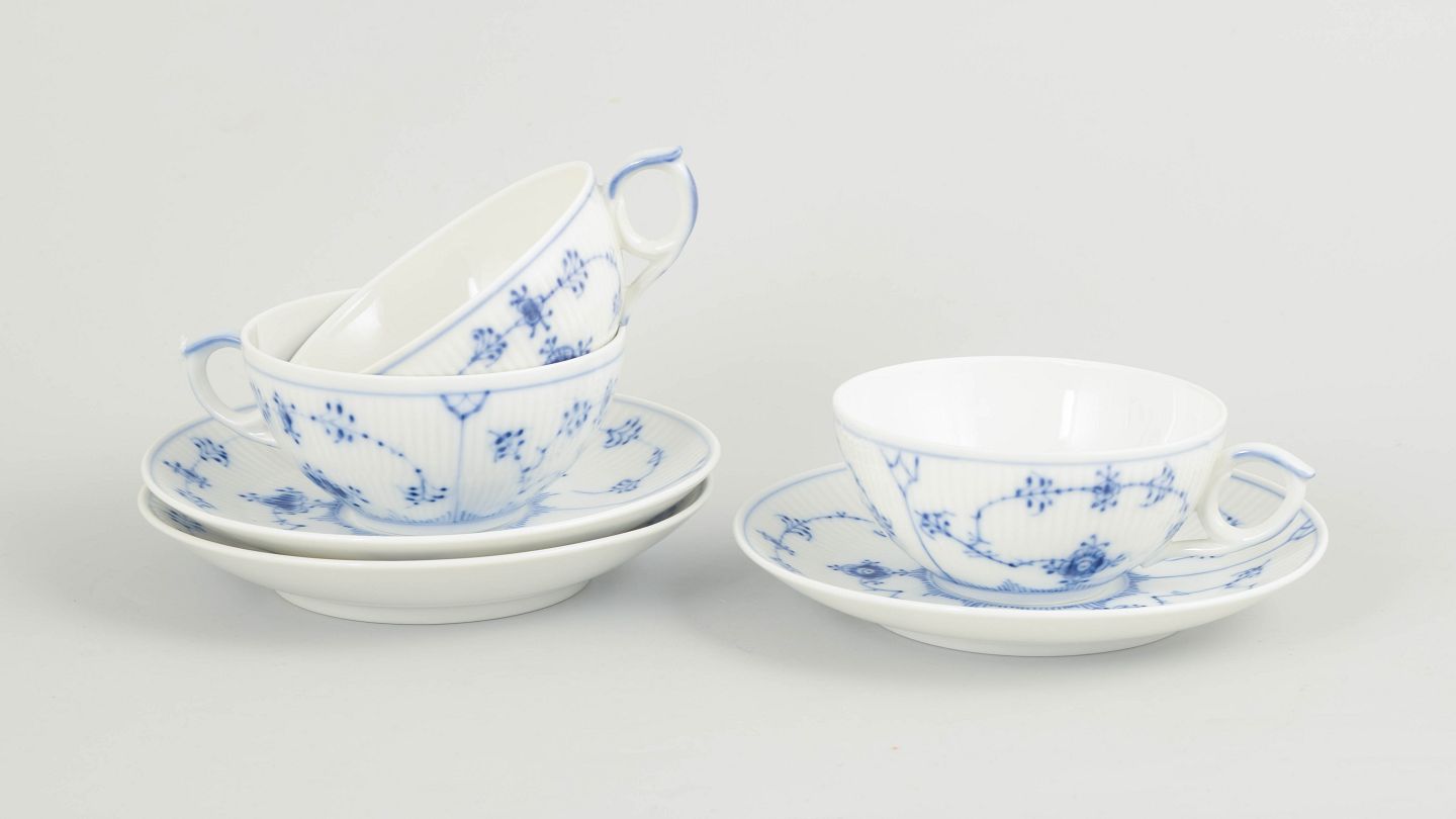 Set of three tea cups with matching saucers in hand-painted porcelain from the Blue Fluted Plain service with classic underglaze cobalt blue decoration and fluted surfaces. Model 1/76. Cups H. 5 cm, D. 12 cm. Saucers D. 15 cm. First factory quality. Produced in the 1960/80s.