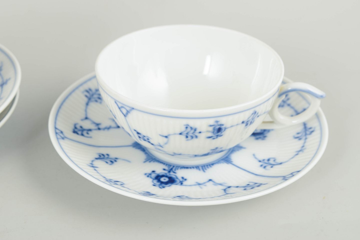 Set of three tea cups with matching saucers in hand-painted porcelain from the Blue Fluted Plain service with classic underglaze cobalt blue decoration and fluted surfaces. Model 1/76. Cups H. 5 cm, D. 12 cm. Saucers D. 15 cm. First factory quality. Produced in the 1960/80s.