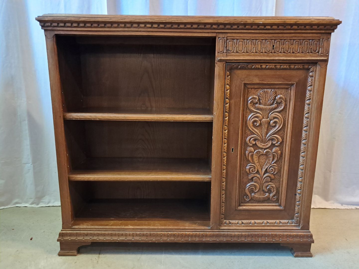 Reol i fineret egetræ, fra 1930erne.