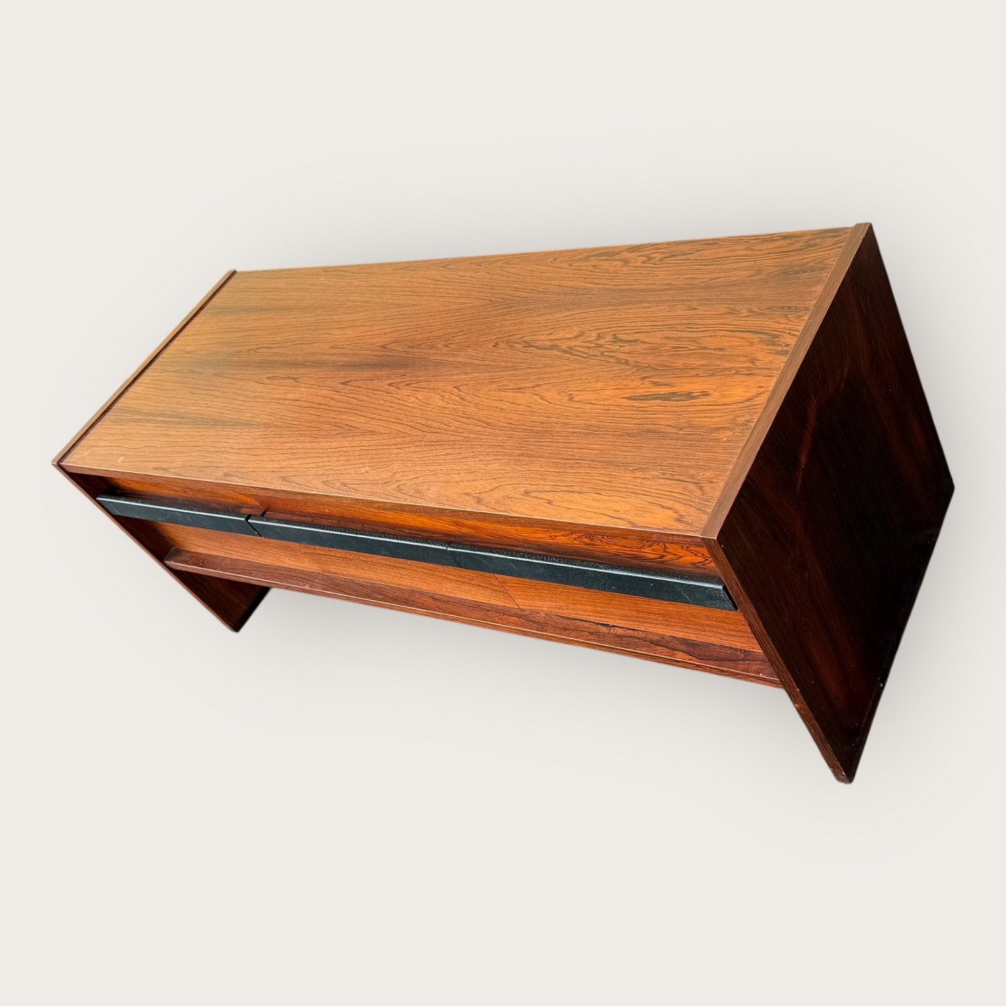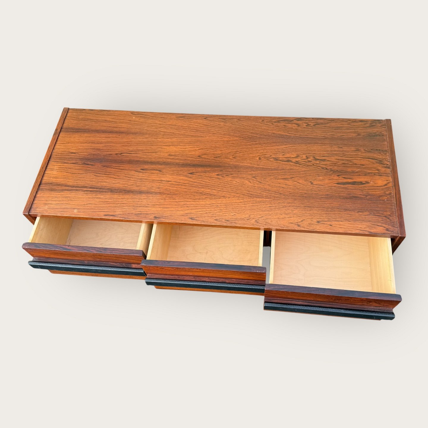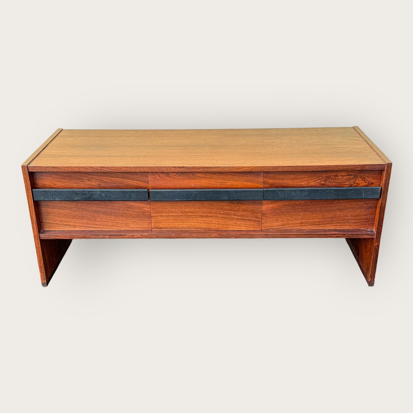 Low sideboard in rosewood veneer, three drawers with leather-covered handles, Discontinued and marked from Illums Bolighus, Dimensions: HxWxD 46x116x45cm, has been a large hallway set in combination with the Rosewood Mirror, item no. 632831 *In good used condition with few signs of wear*
