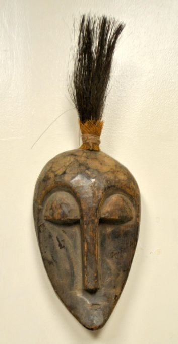 Kleine, geschnitzte afrikanische Holzmaske, Mitte des 20. Jahrhunderts. Oberseite aus Tierhaar. Höhe: 30 cm.