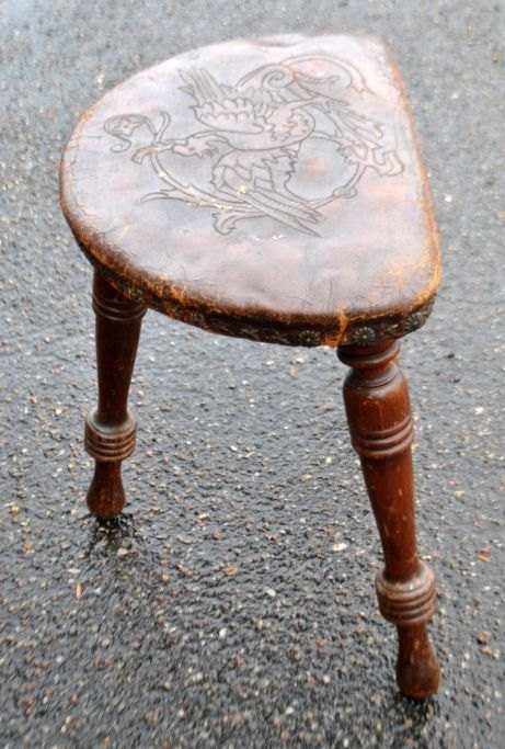 Three-legged wooden stool with leather seat, 19th century.