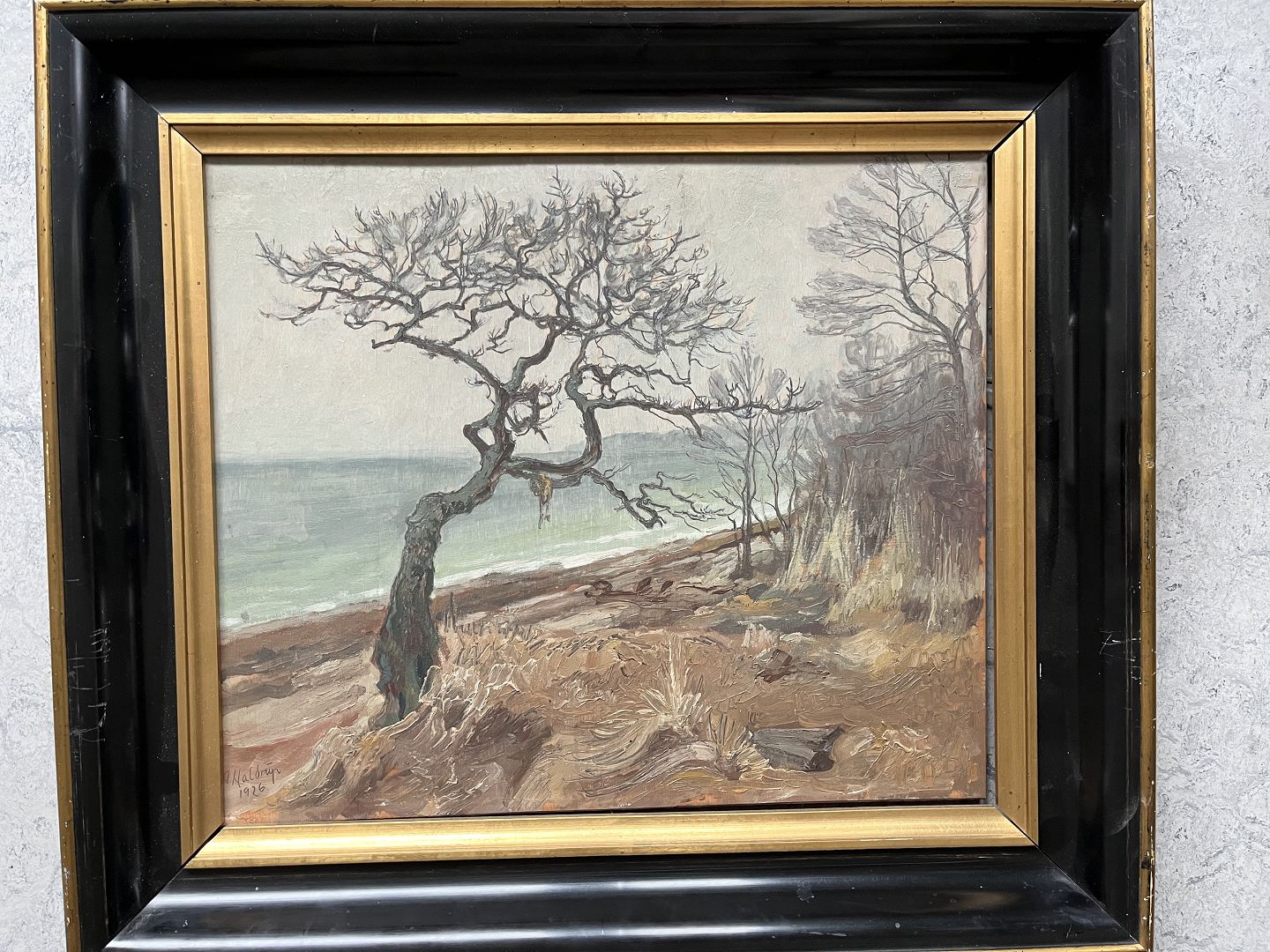 Text available in Danish: Maleri af Aksel Haldrup 1926 - Nøgent træ ved vandkant.