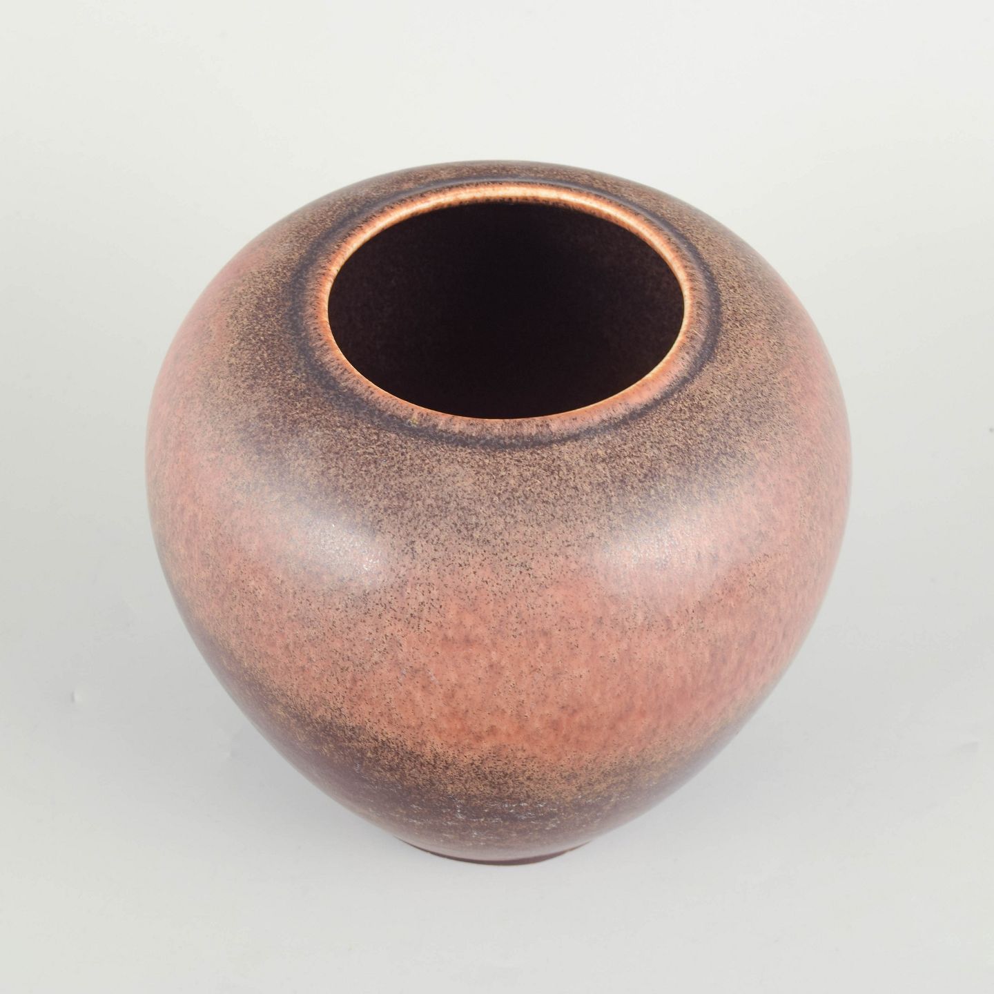 Large, rounded stoneware vase with wide opening and full-bodied silhouette. The glaze displays warm pink and brown tones with soft transitions and a deep, vibrant surface character, typical of Saxbo’s experimental glaze work.