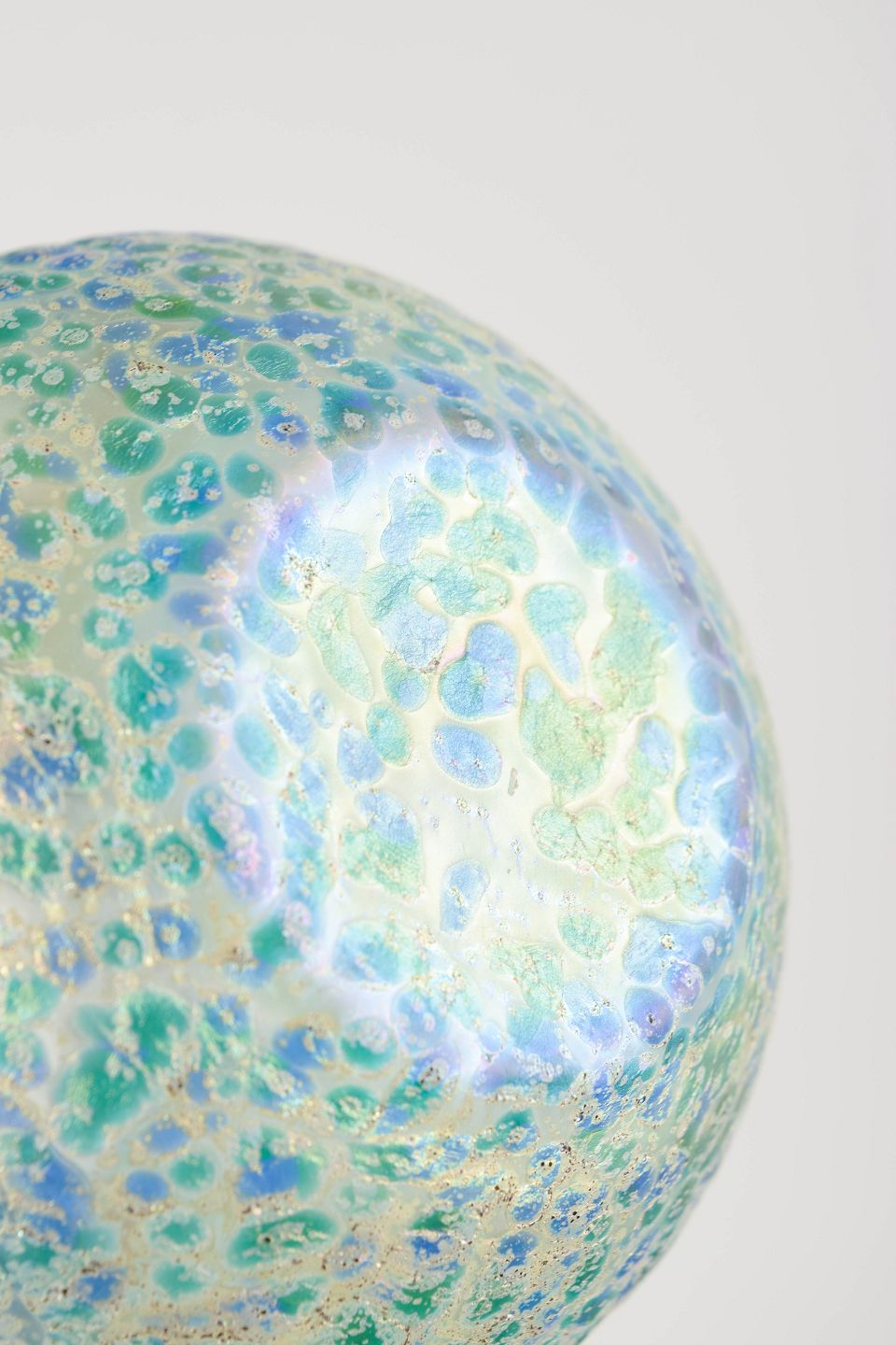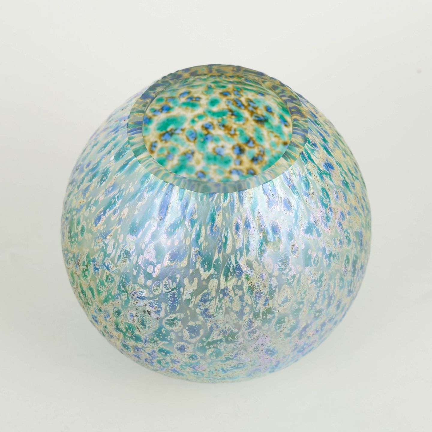 Globular vase in mouth-blown glass with a slightly narrowed opening and rounded body. The surface features a strong iridescent decoration in blue, green and golden tones with a dense, organic texture that creates a vibrant, almost mosaic-like colour play. The compact form combined with the rich surface effect is characteristic of Loetz production in the 1920s, when experimental decorative techniques continued beyond the art nouveau period.