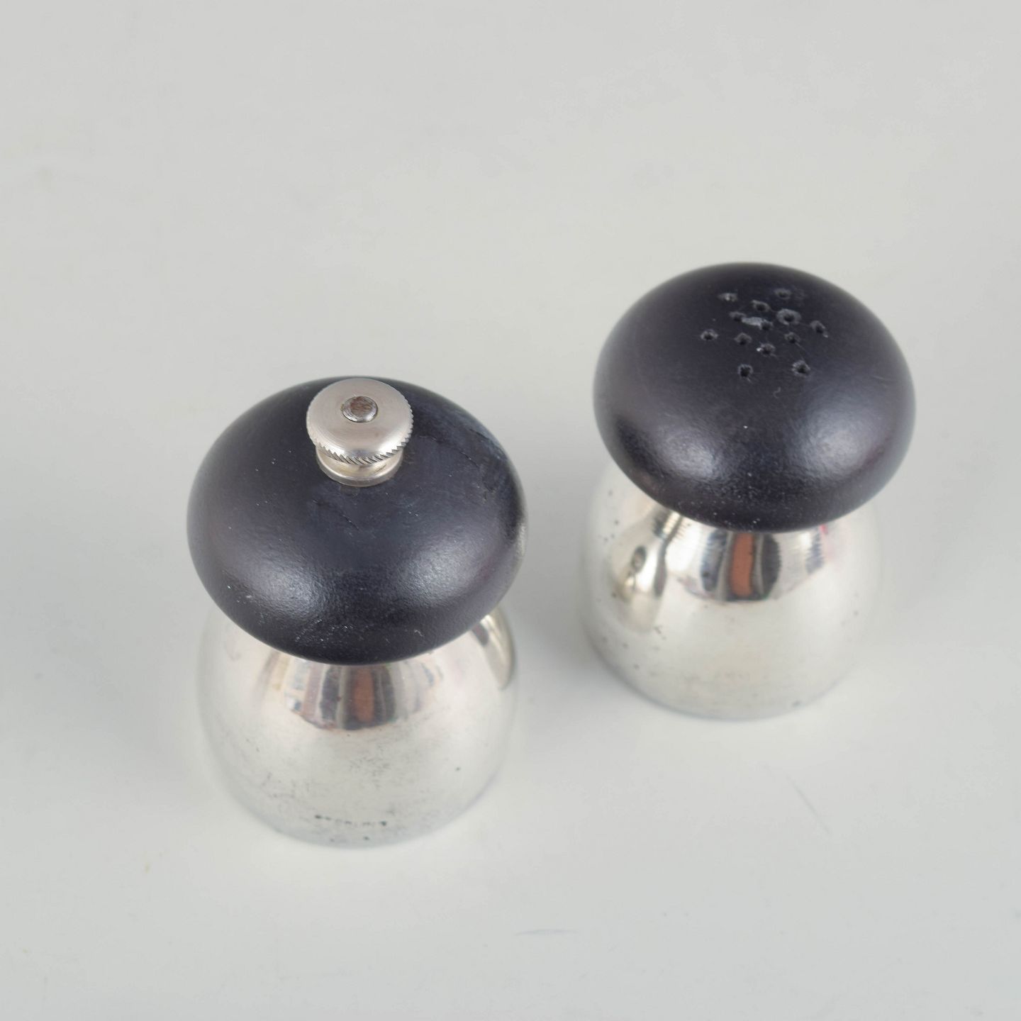 Pair of compact and elegantly shaped salt and pepper shakers in sterling silver with dark wooden finials. The softly rounded forms are characteristic of mid-20th-century Italian design.