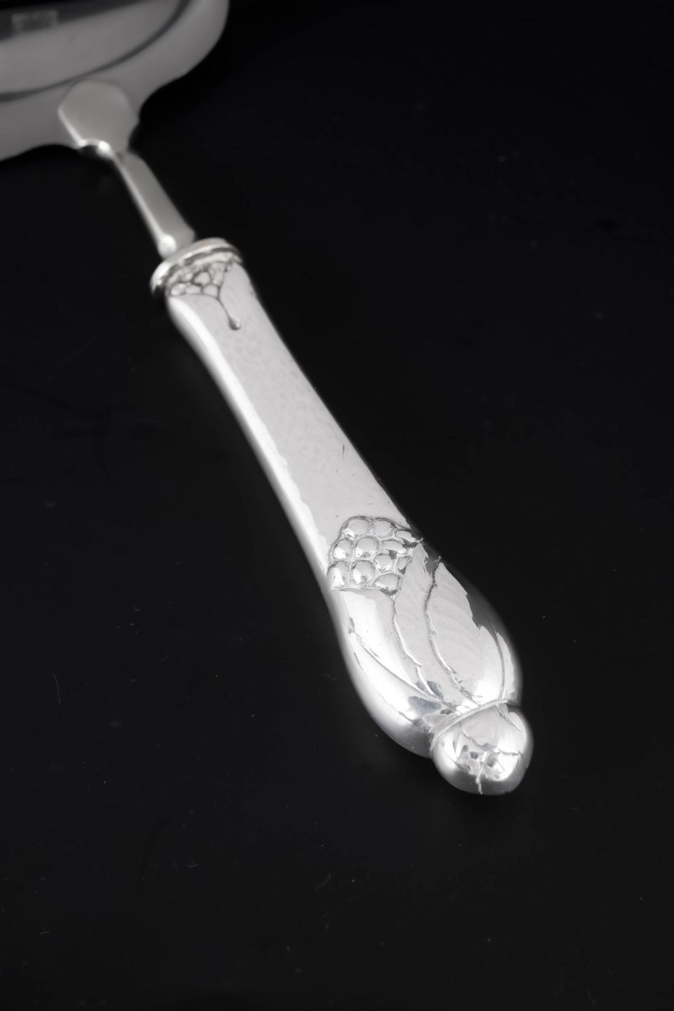 Art Deco cheese slicer in 830 silver and stainless steel. Model number 6 with a decorative handle in relief featuring a stylised floral motif. Produced by Evald Nielsen.