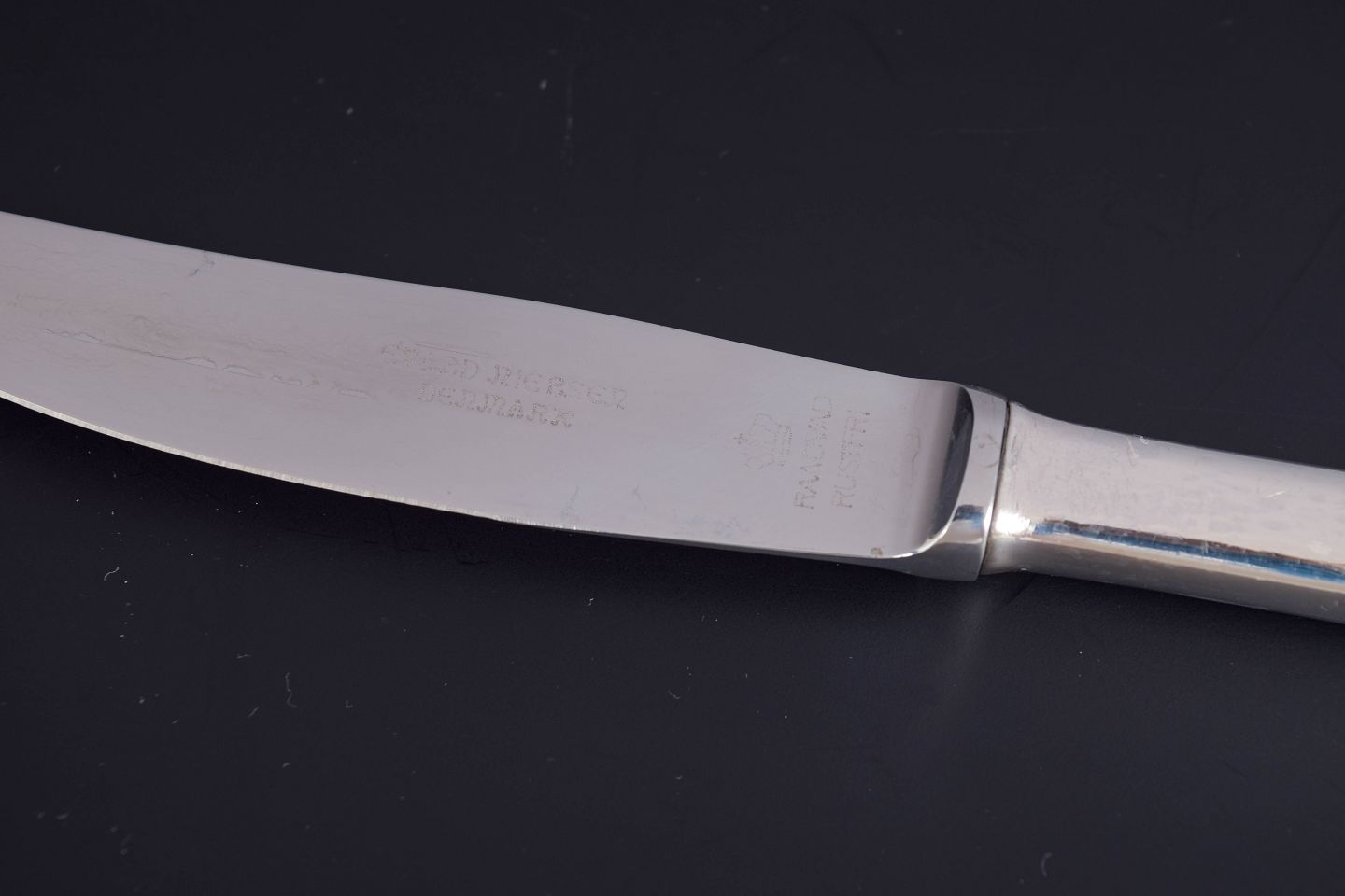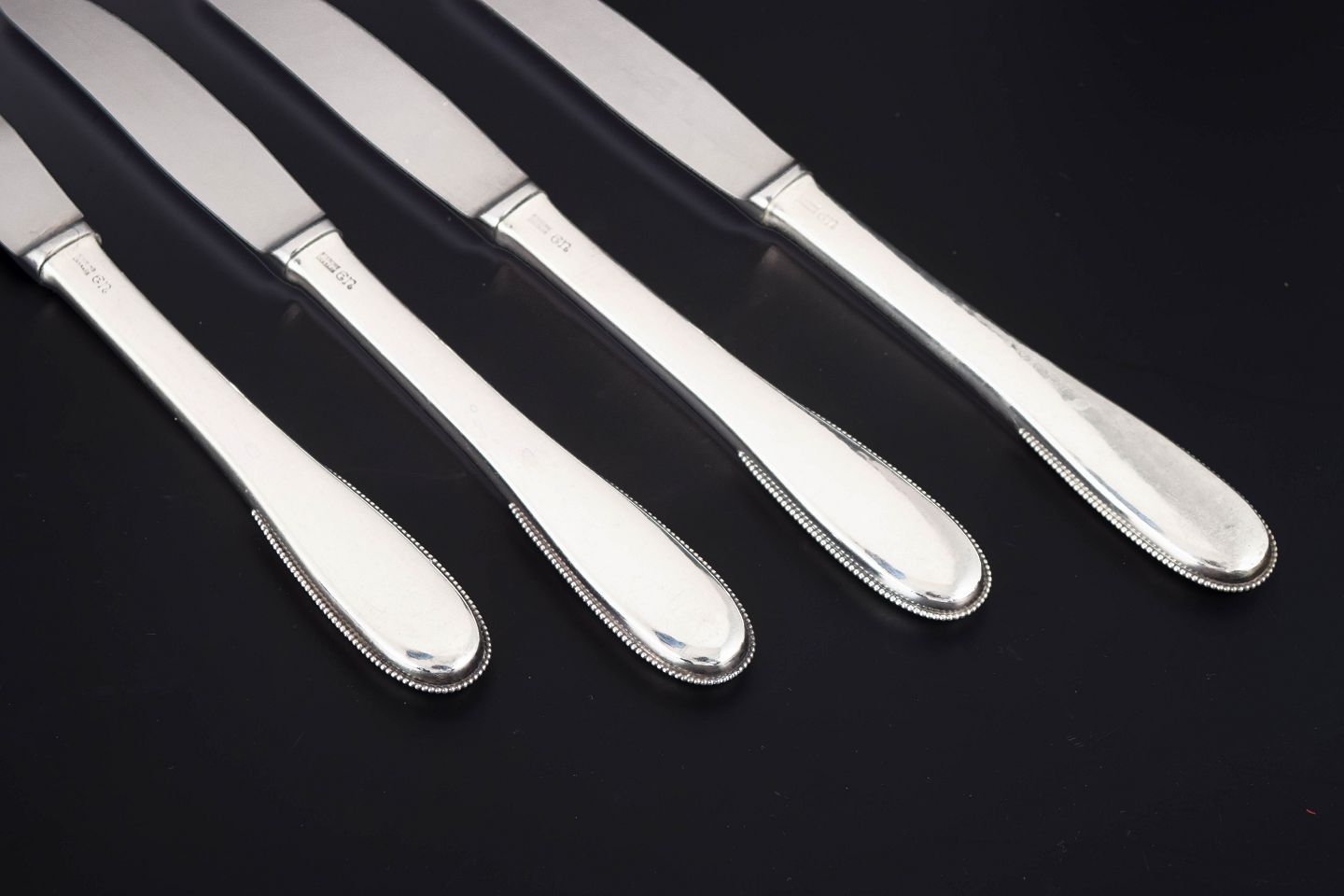 Elegant lunch knives in sterling silver and stainless steel. Model number 14 with a classic softly rounded handle with a subtle beaded edge and plain blade. Produced by Evald Nielsen.
