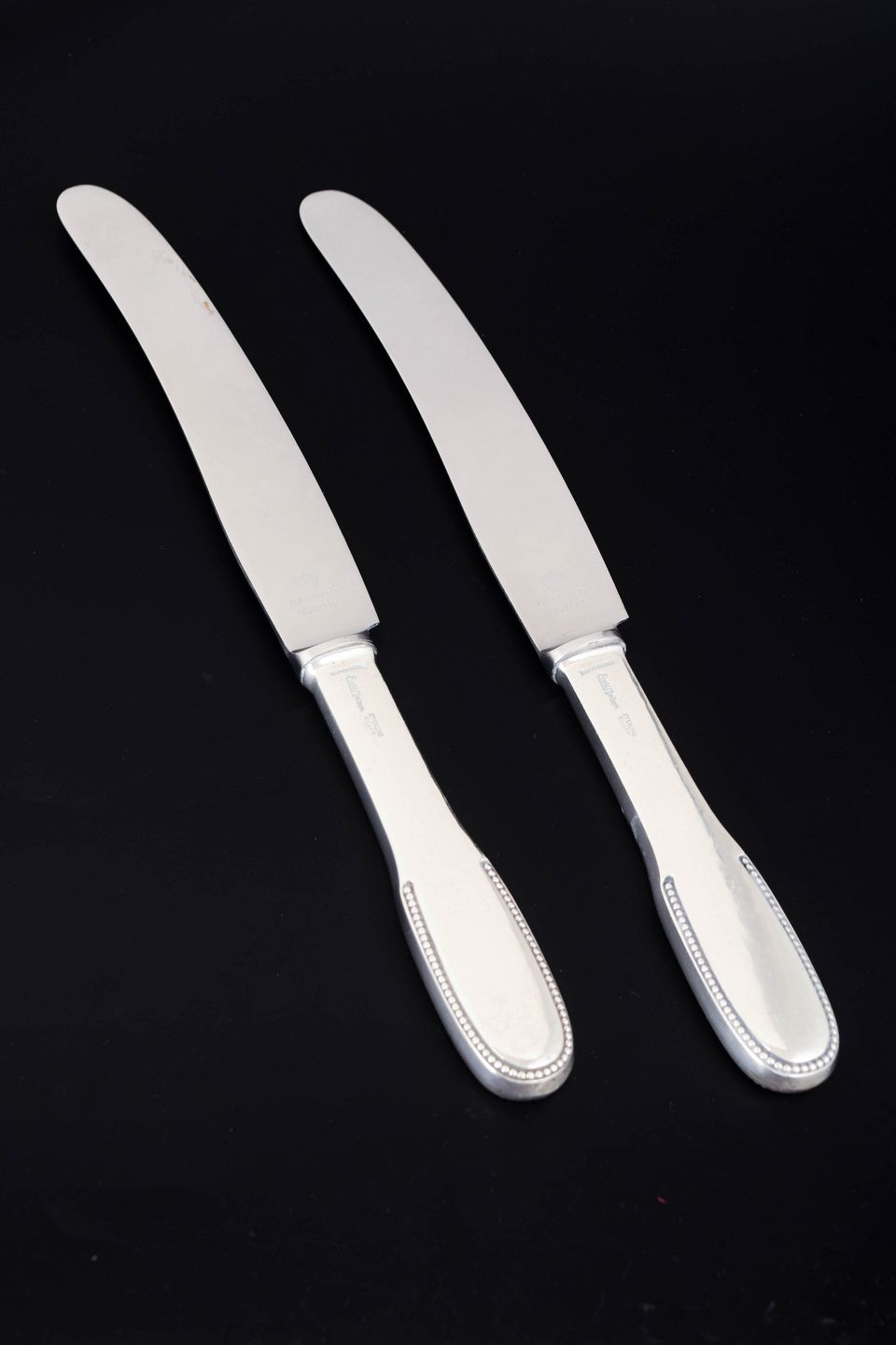 Elegant dinner knives in sterling silver and stainless steel. Model number 14 with a classic softly rounded handle with a subtle beaded edge and plain blade. Produced by Evald Nielsen.