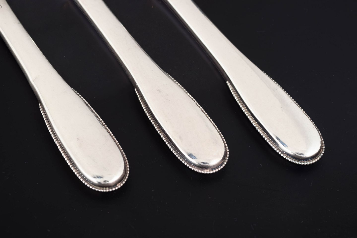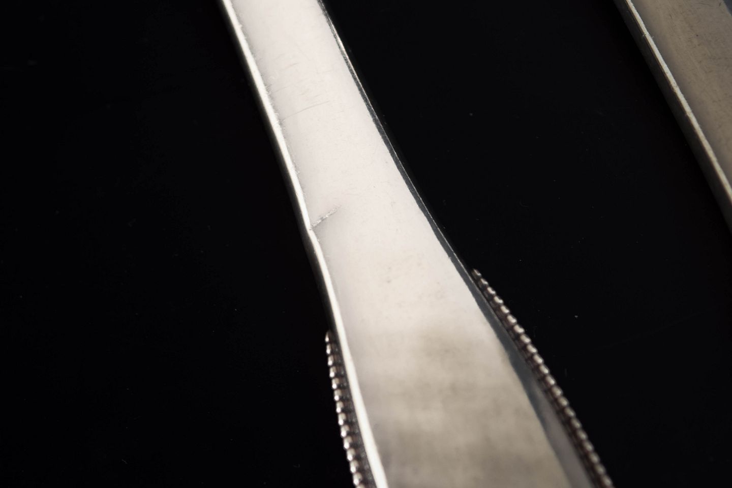 Elegant dinner knives in sterling silver and stainless steel. Model number 14 with a classic softly rounded handle with a subtle beaded edge and plain blade. Produced by Evald Nielsen.