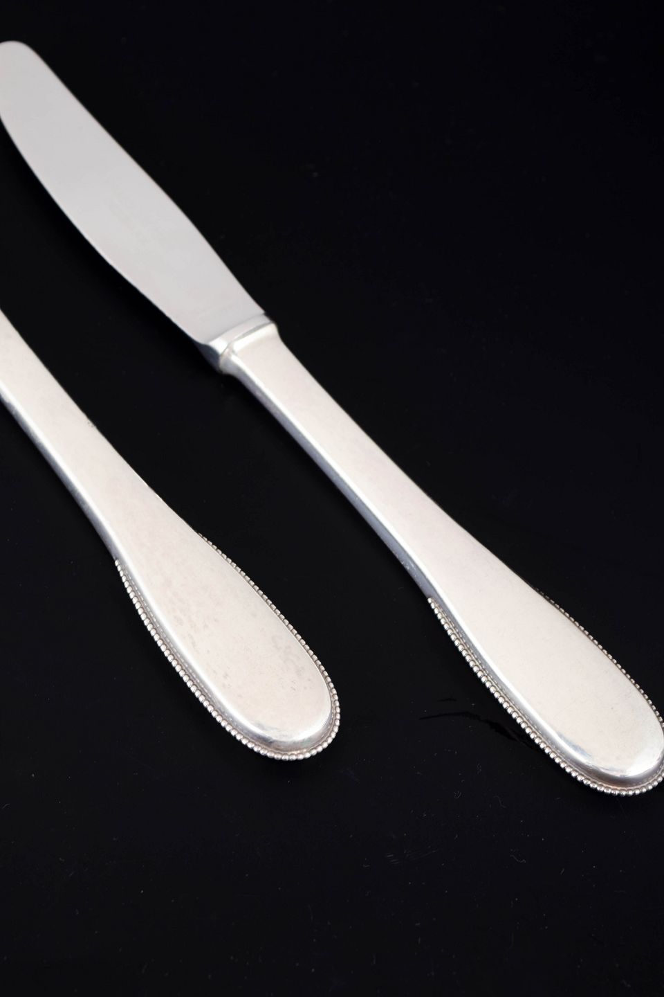 Elegante middagsknive i sterlingsølv og rustfrit stål. Model nummer 14 med klassisk, let afrundet skaftform med diskret perlekant og glat klinge. Fremstillet hos Evald Nielsen.
