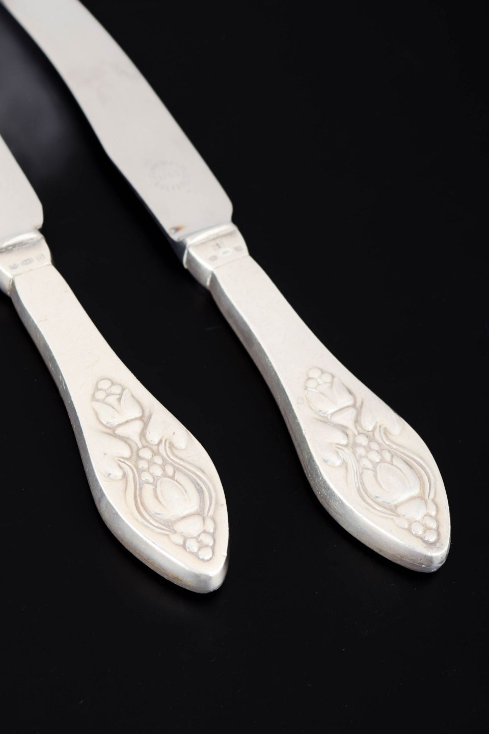 Two fruit knives in stainless steel and sterling silver in the Fuchsia pattern from Georg Jensen. The handles are decorated with a stylised floral motif inspired by the fuchsia flower, executed in relief with soft organic lines characteristic of Georg Jensen’s early Art Nouveau designs.