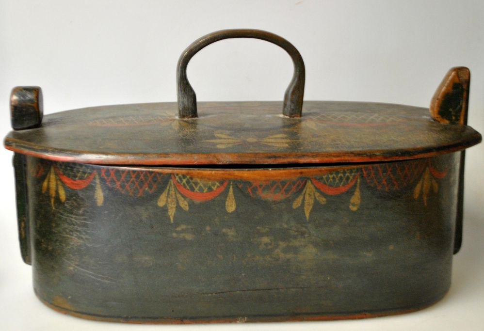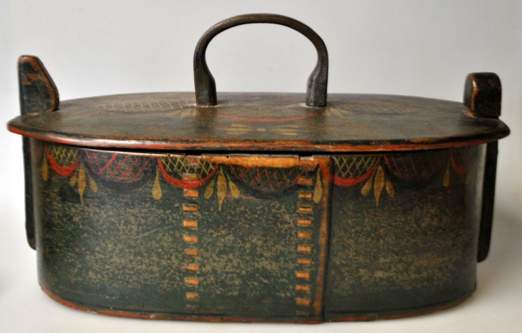 Wooden lunch box with lid, approx. 1820-1830, Denmark. Painted in green with red and golden decoration. H. incl. handle: 19.5 cm. L: 34 cm. W: 18 cm.
