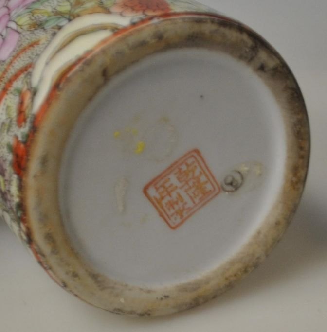 Chinese porcelain brush cup, 20th century. With decoration in transfer technique in the form of birds and flowers. Stamped. H.: 12.5 cm.