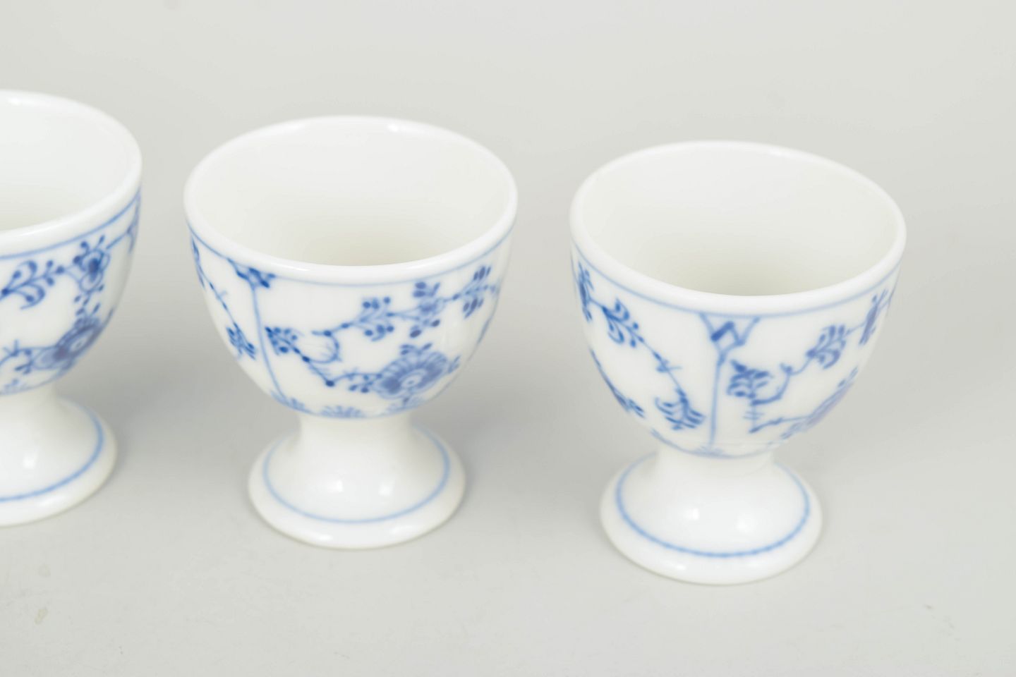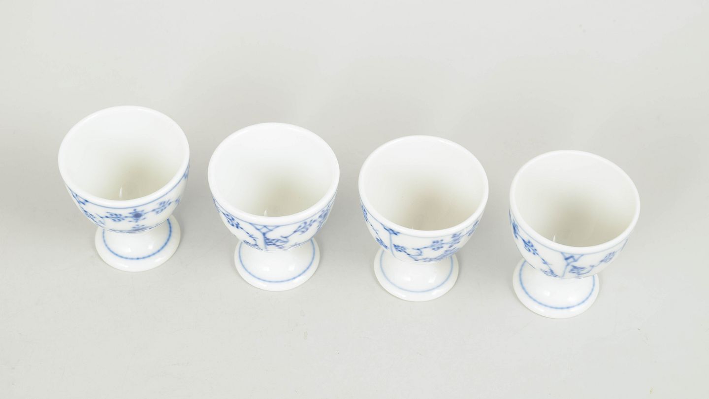 Set of four hand-painted porcelain egg cups decorated with the classic blue fluted pattern in cobalt underglaze. The egg cups feature a rounded bowl with small foot and are decorated with the characteristic floral motifs and stylised garlands of the series.