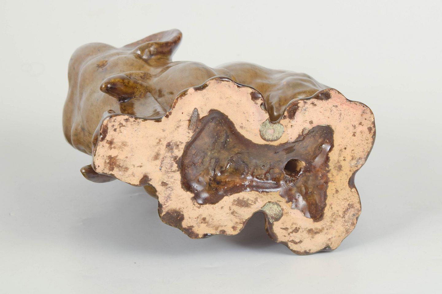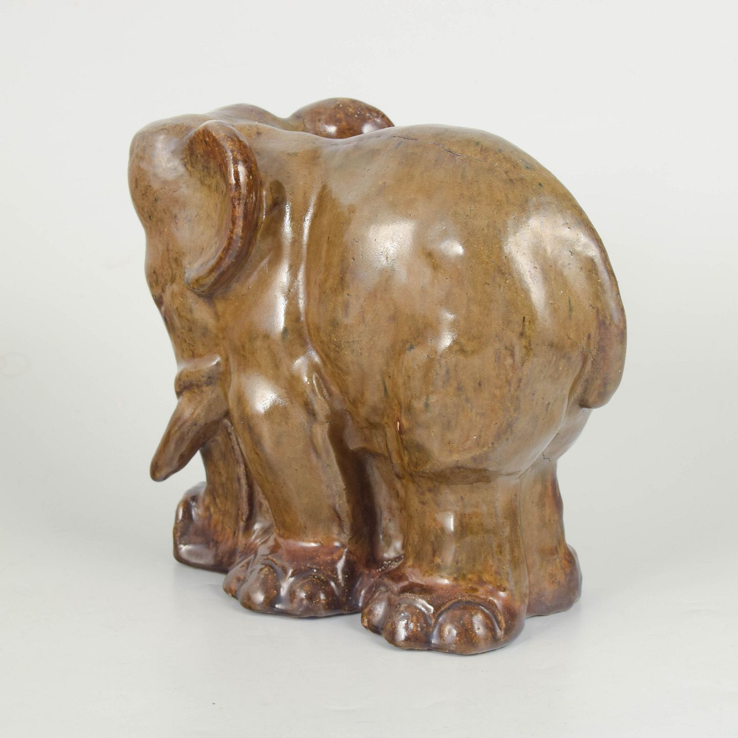 Naturalistic elephant sculpture executed in glazed stoneware with warm brown tonal variations and a lively glaze surface. The figure is modelled with a soft, organic form and expressive character, typical of Poul Kyhn’s animal sculptures. Signed and appearing as a unique piece from the artist’s early production.