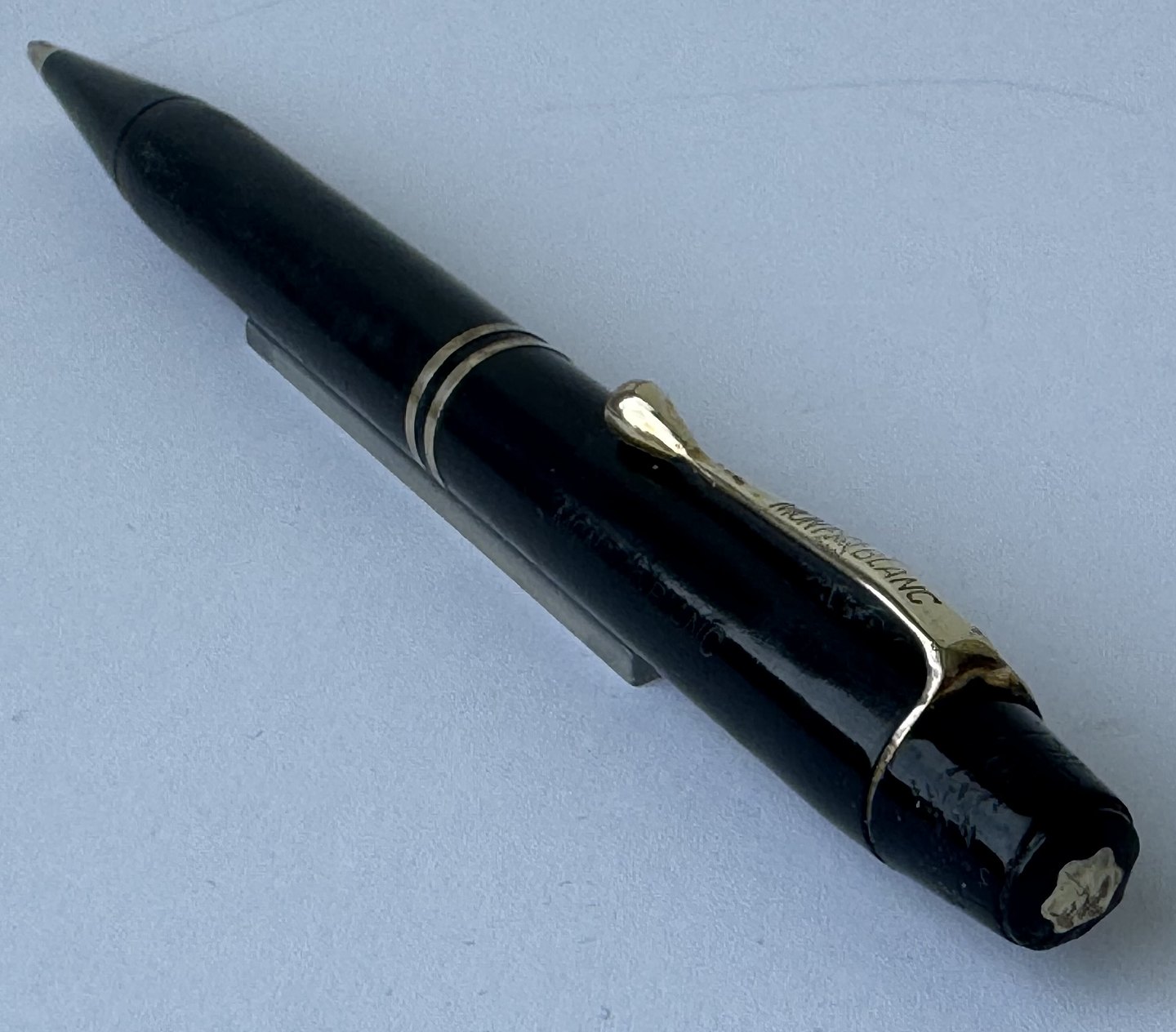 Black Montblanc no. 54 mechanical pencil. Works fine but has some signs of wear, including on the surface at the top (a few scratches). No damage to note. Manufactured around 1950. Length 13 cm