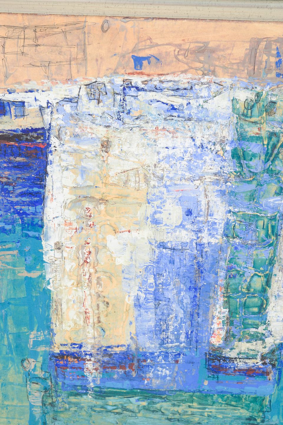 Abstract composition executed in oil on board with textured brushwork and a nuanced palette dominated by blue and turquoise tones. Signed.