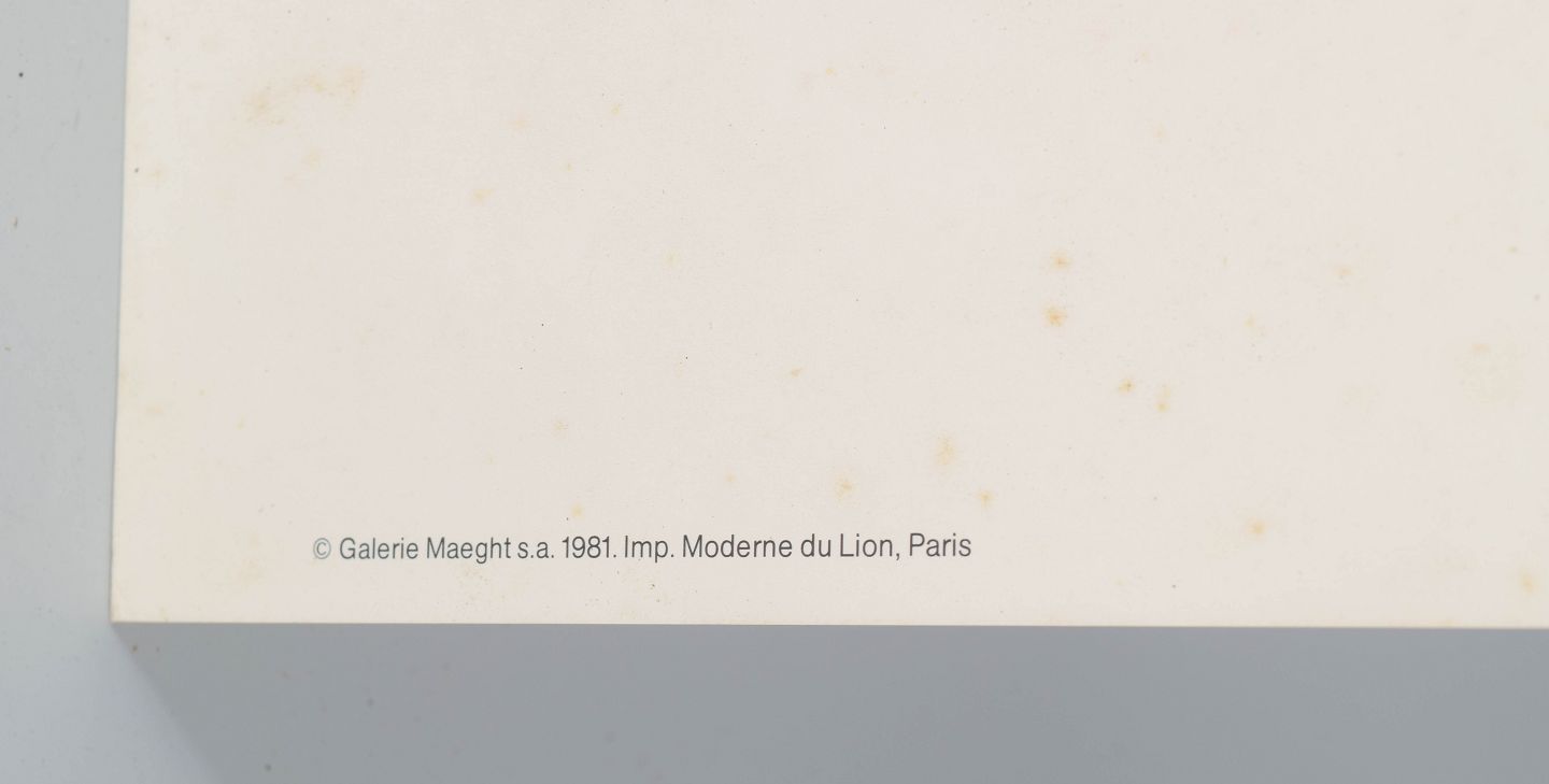 Poster published in connection with the exhibition “Lithographies originales récentes” at Galerie Maeght, Paris, 20 May – 10 July 1981. The motif shows a characteristic poetic and dreamlike scene with floating figures and architectural elements, rendered in Chagall’s recognisable style with soft colours and lyrical linework.