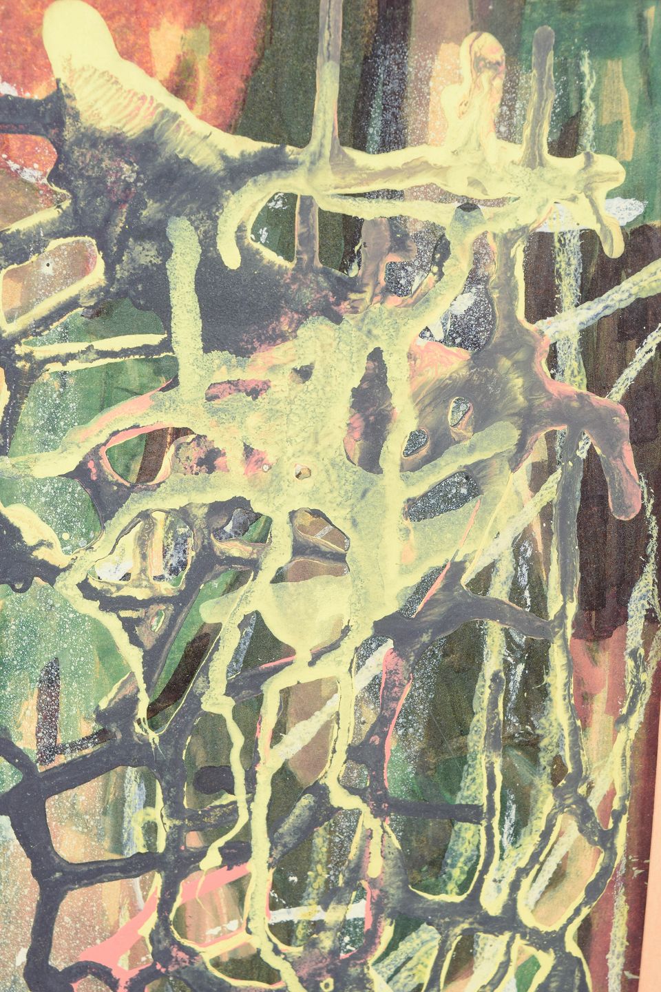 Abstract composition executed in mixed media on paper with layered colour, dripping lines and expressive brushwork in green, yellow, black and pink tones. The composition has a spontaneous, gestural character with overlapping forms and textures.