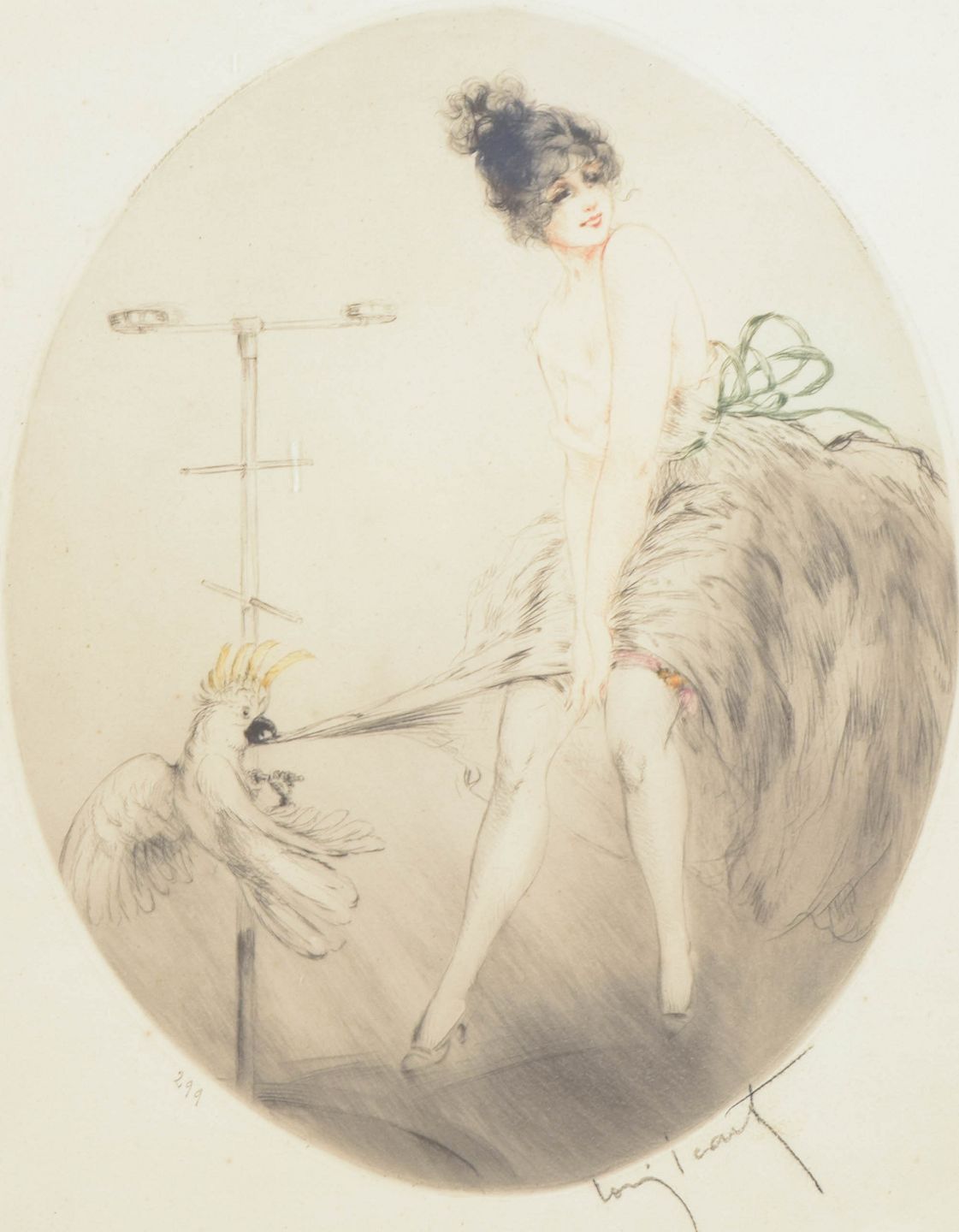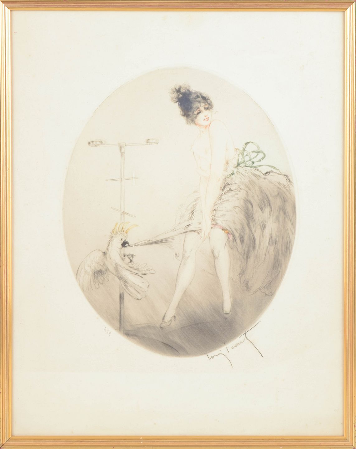 Louis Icart, colour etching “Jeune femme et perroquet”, listed French artist.