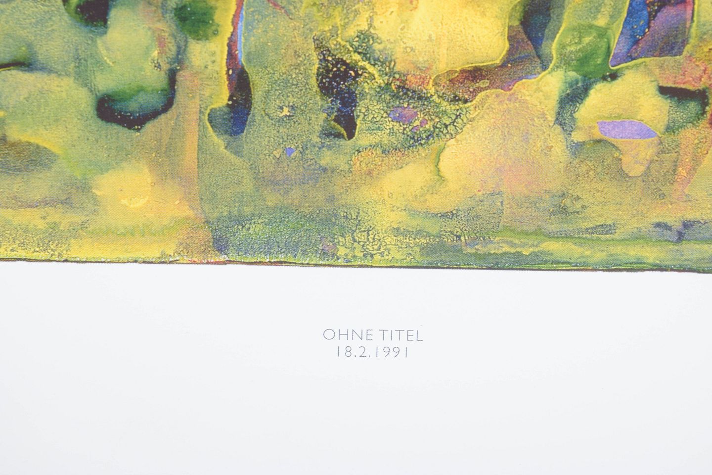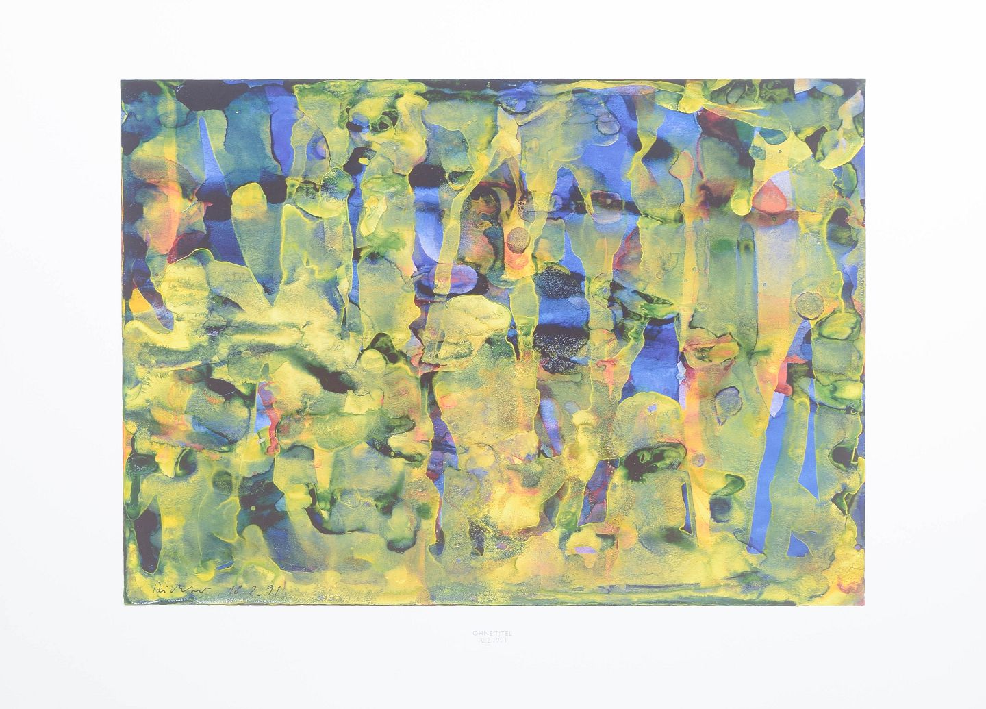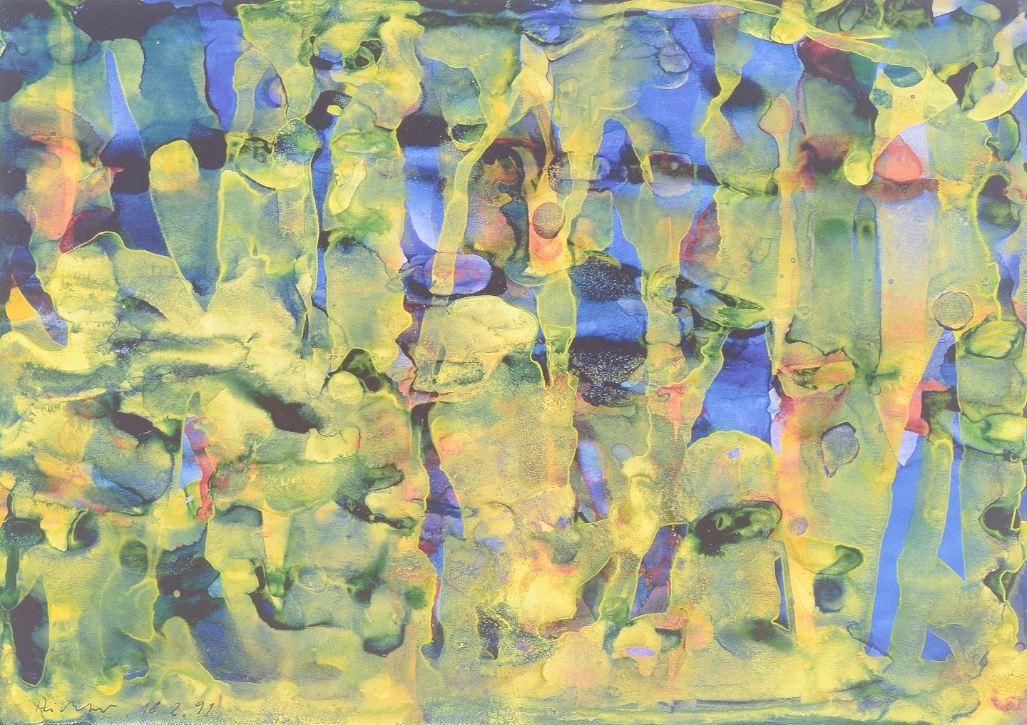 Abstract composition executed as a colour print with fluid organic forms in layered tones of green, blue, yellow and violet. The motif displays a dissolved structure with vertical traces and translucent colour fields. Signed in the print and dated 1991.