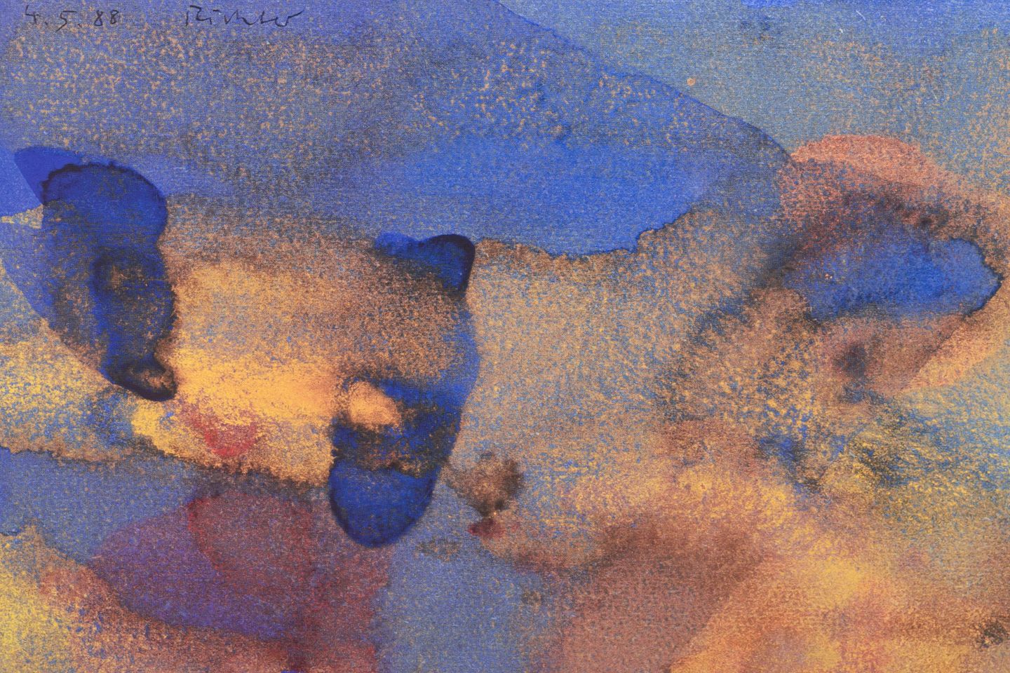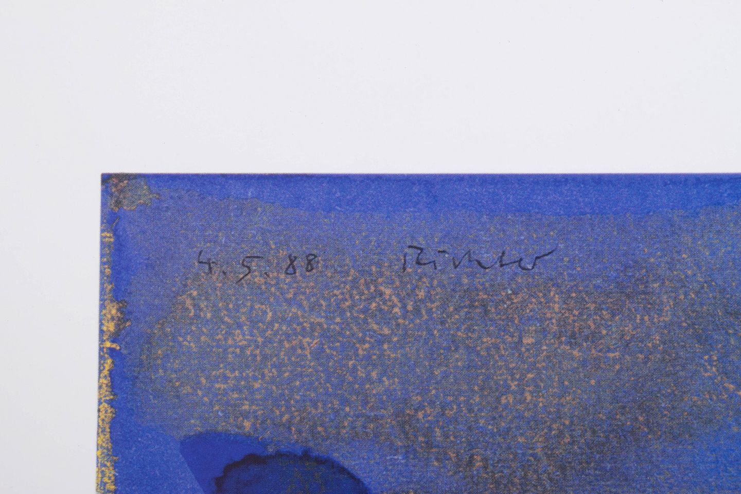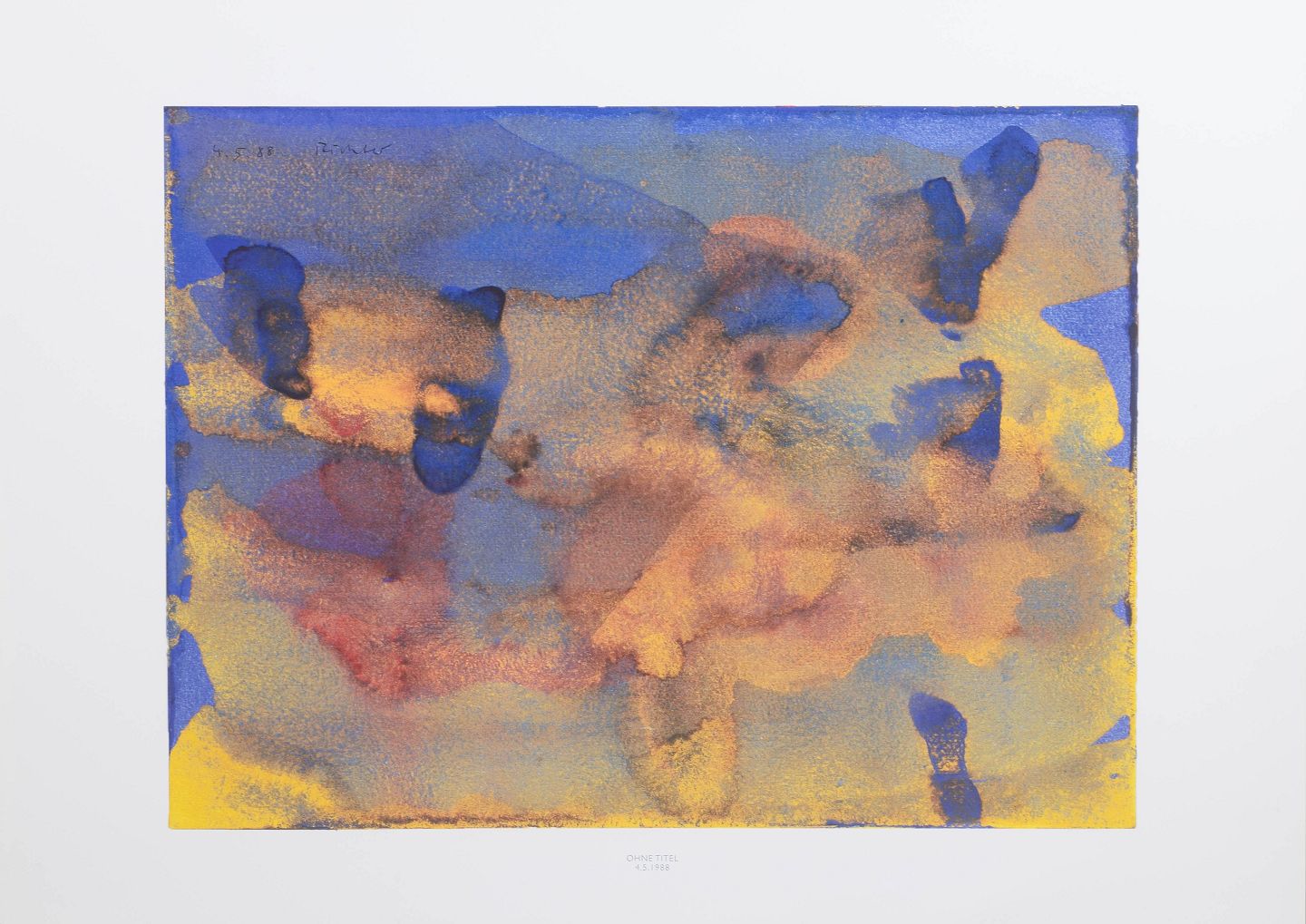 Abstract composition executed as a colour print with soft transitions in blue, pink, yellow and beige tones. Signed in the print and dated 1988.