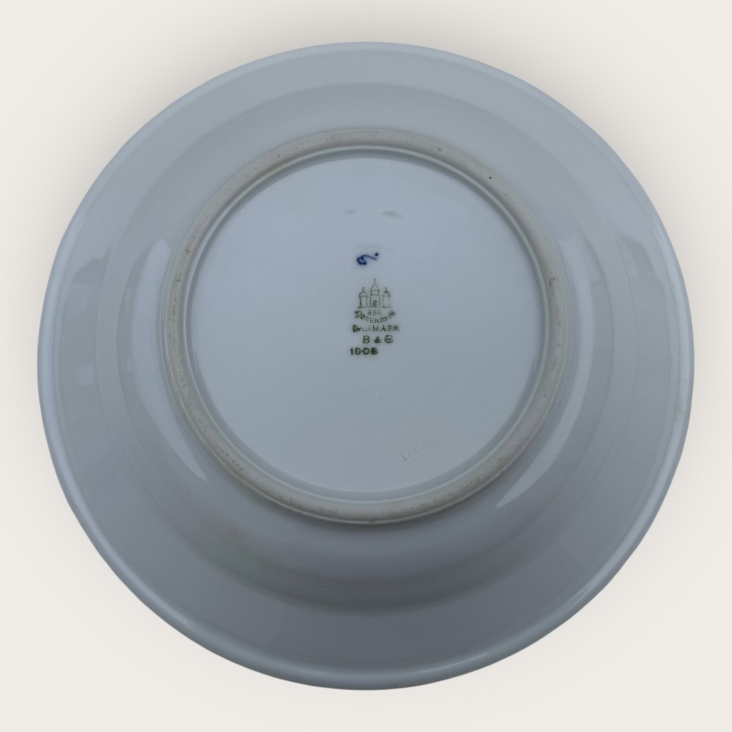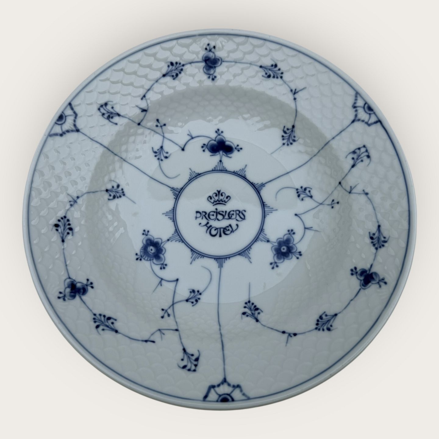 Bing & Grondahl, Blue painted (Blue Fluted), #1008, large deep plate in hotel porcelain (Iron porcelain) with logo from Preislers Hotel, 25cm in diameter, 1st grade * Good condition*