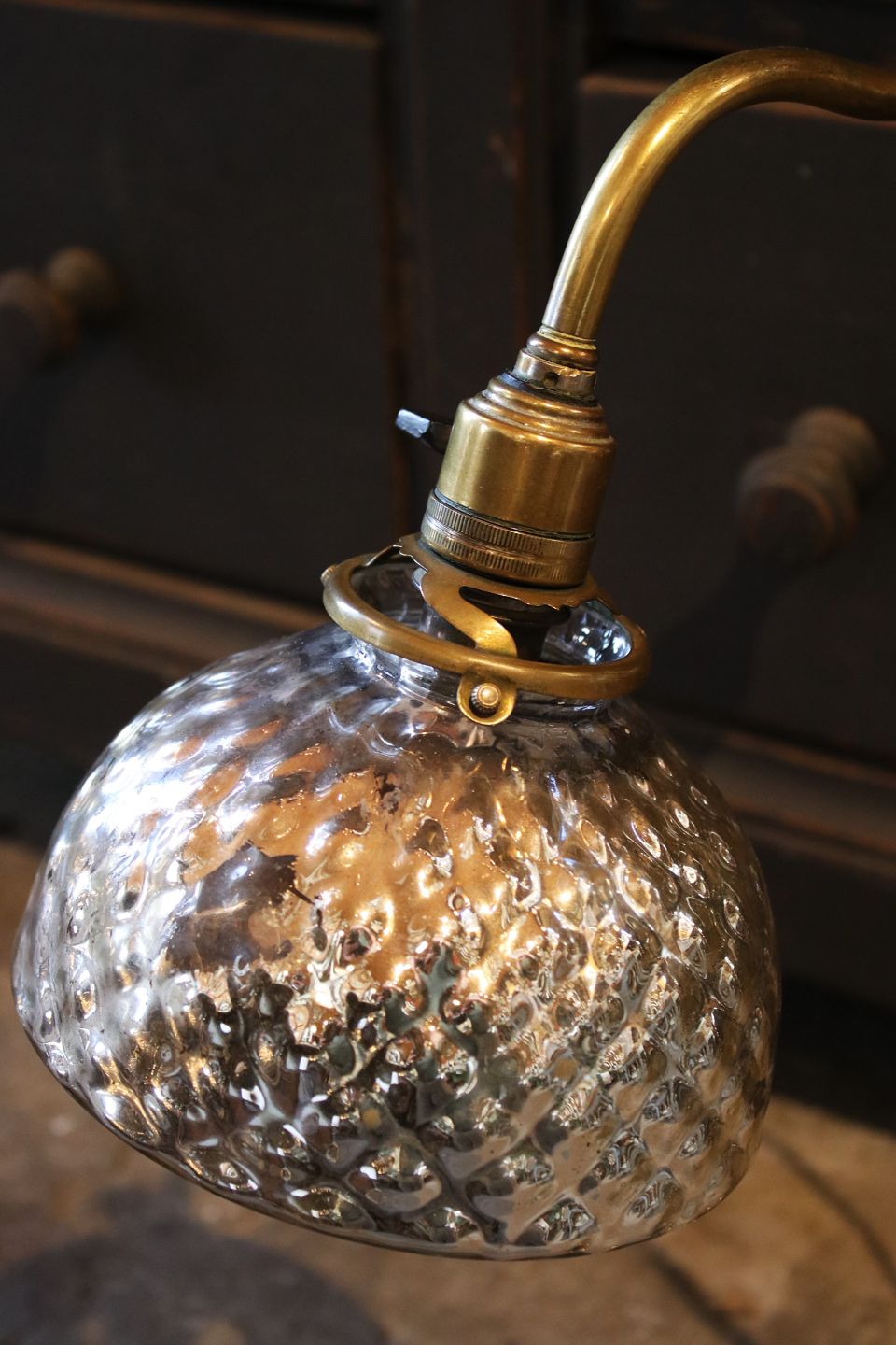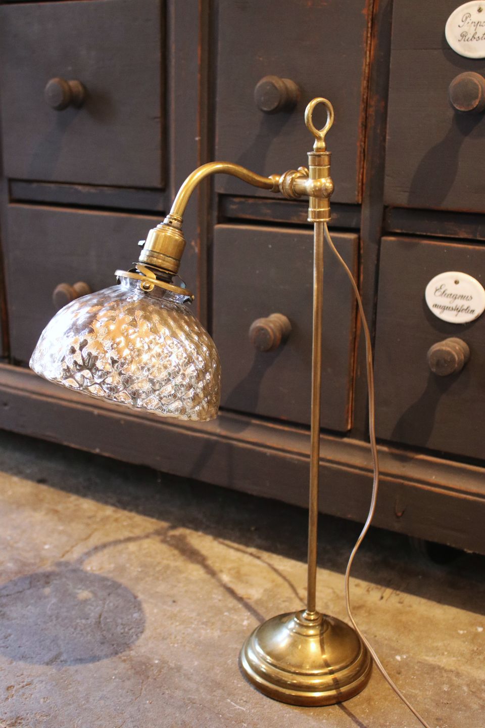 Old French Bureau table lamp in brass with original lampshade in waffled Mercury glass...