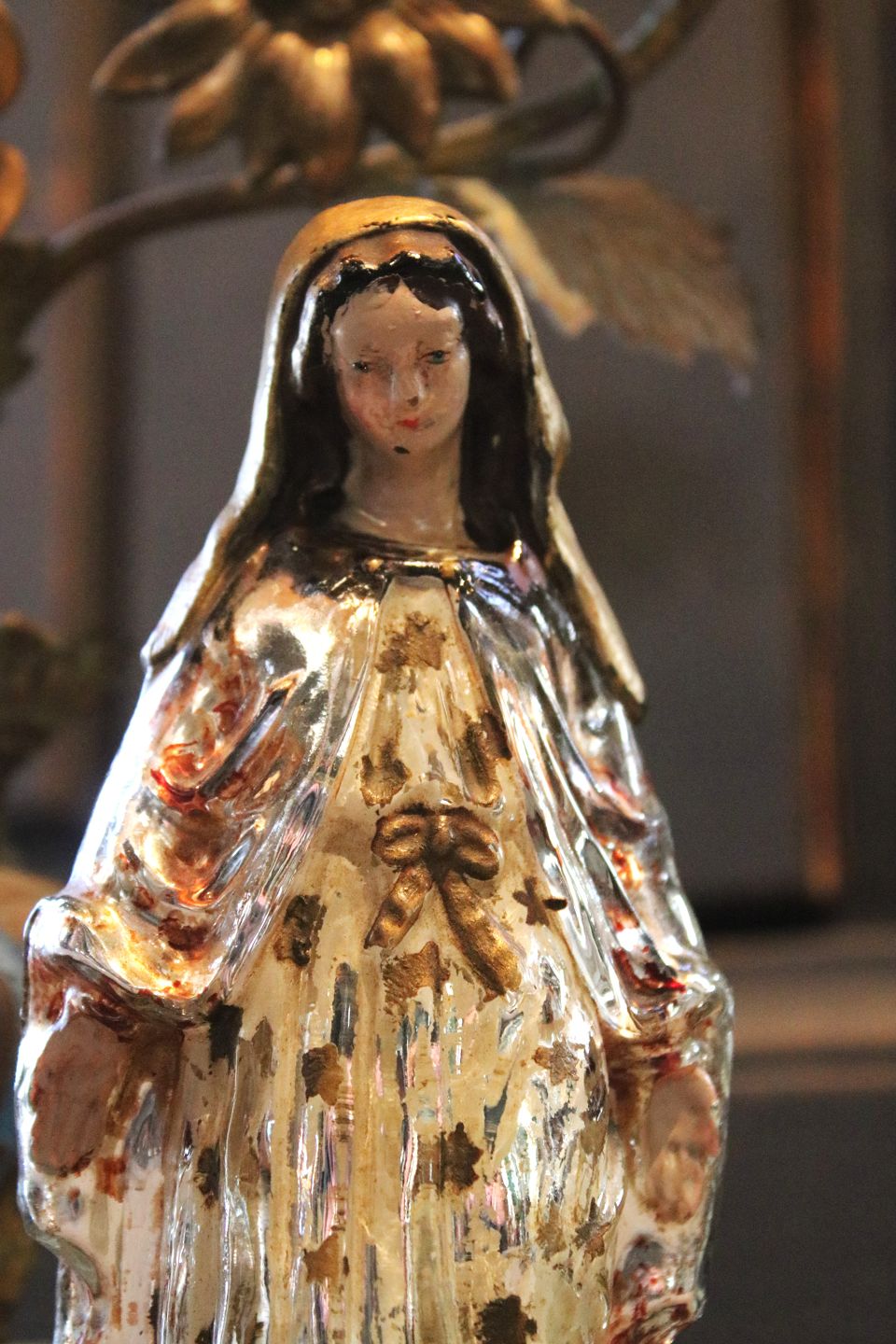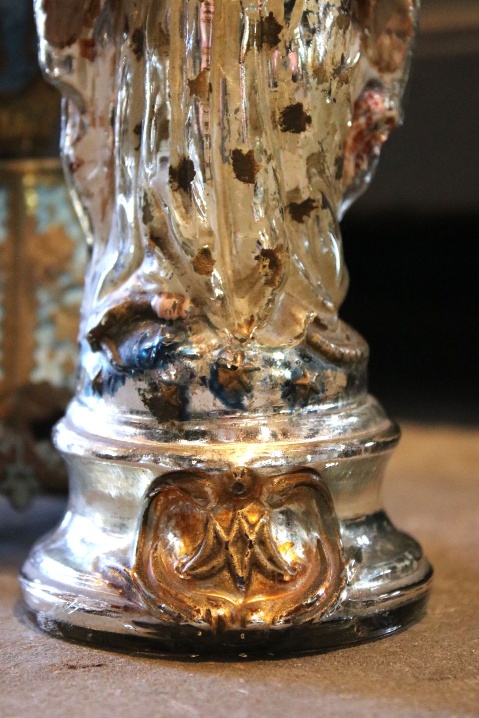 Antique 19th century Madonna figurine in poor man's silver / Mercury glass with fine old painting...