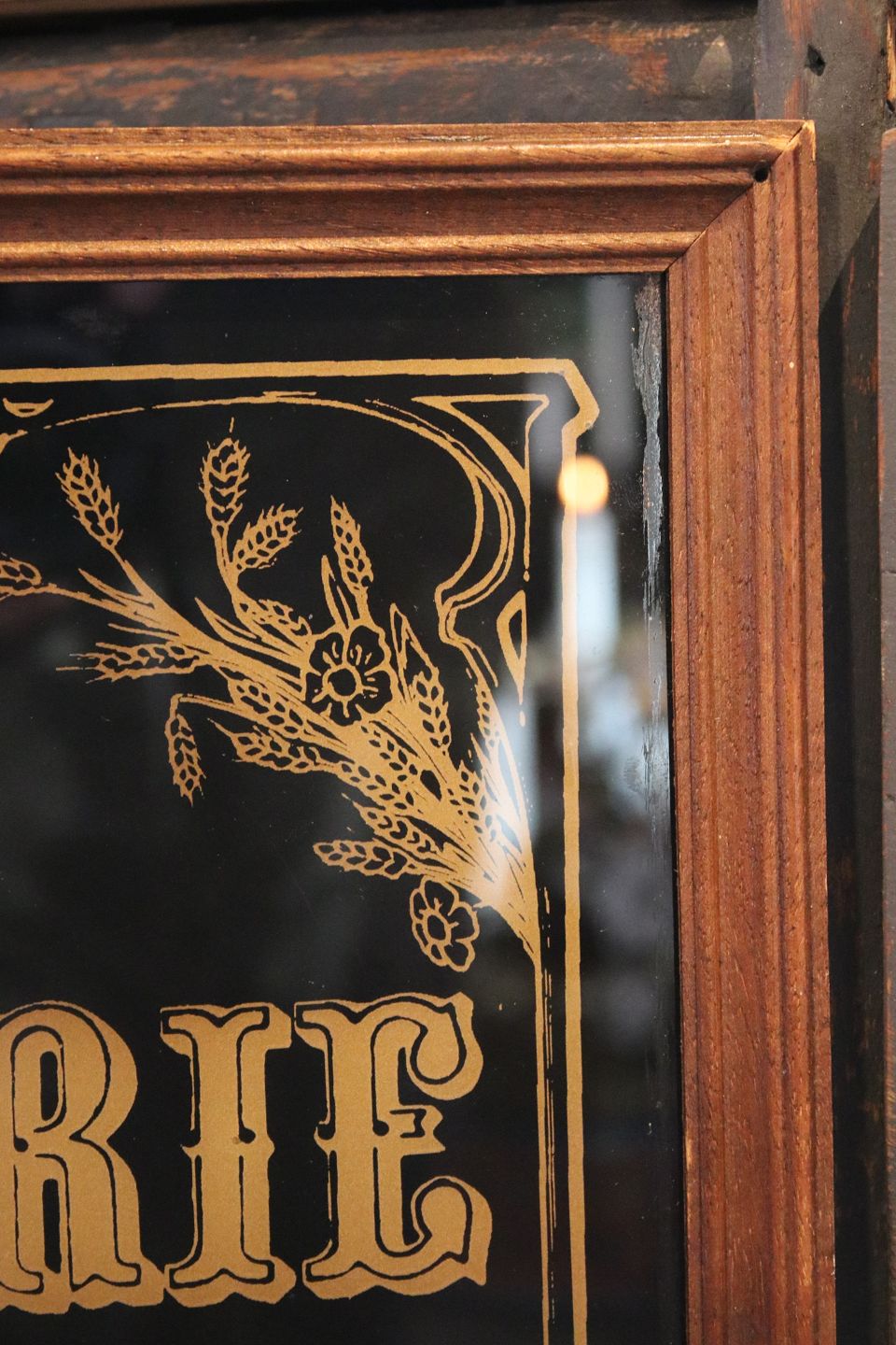 Advertising sign from an old French pastry shop / baker, painted on glass "Boulagerie"...