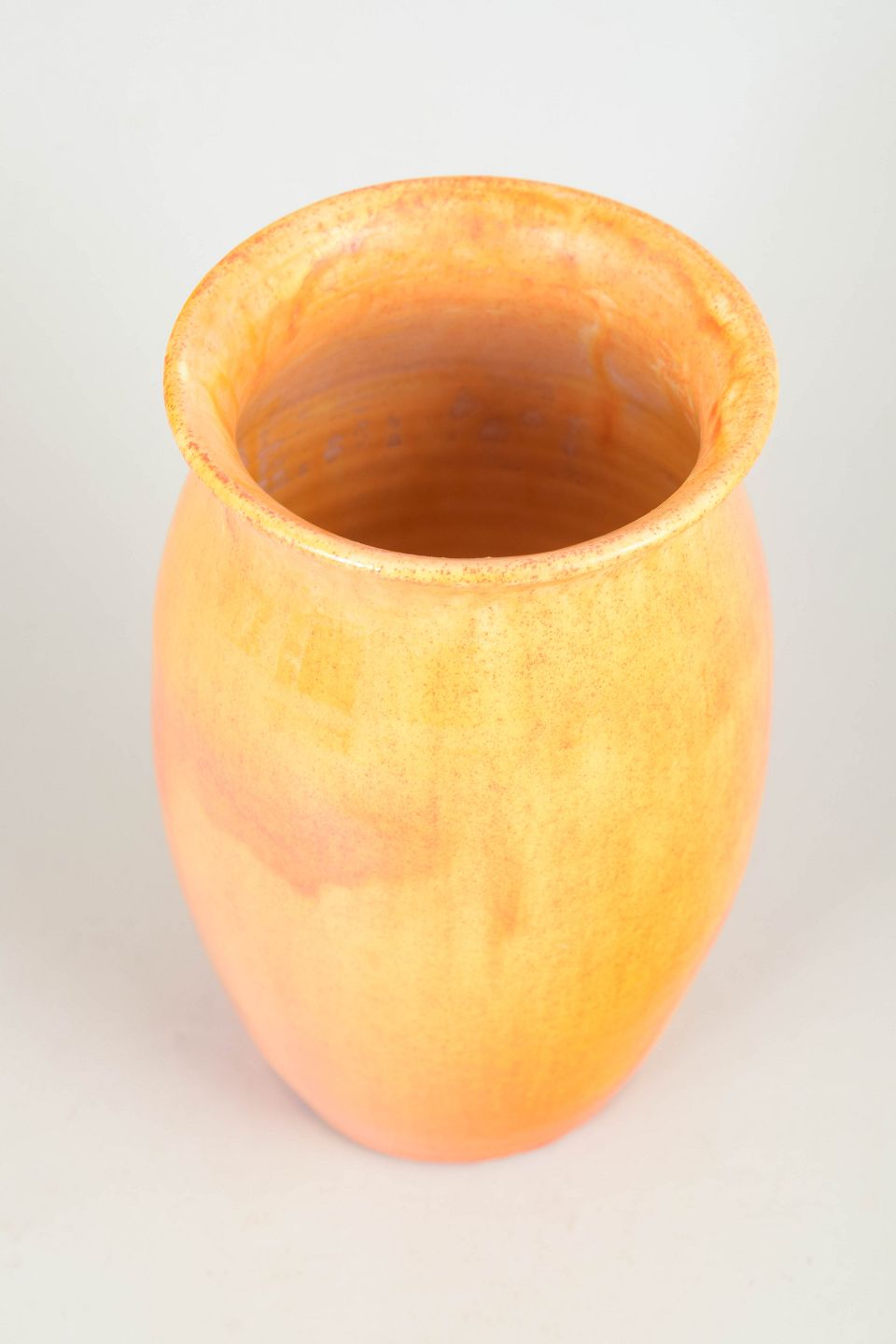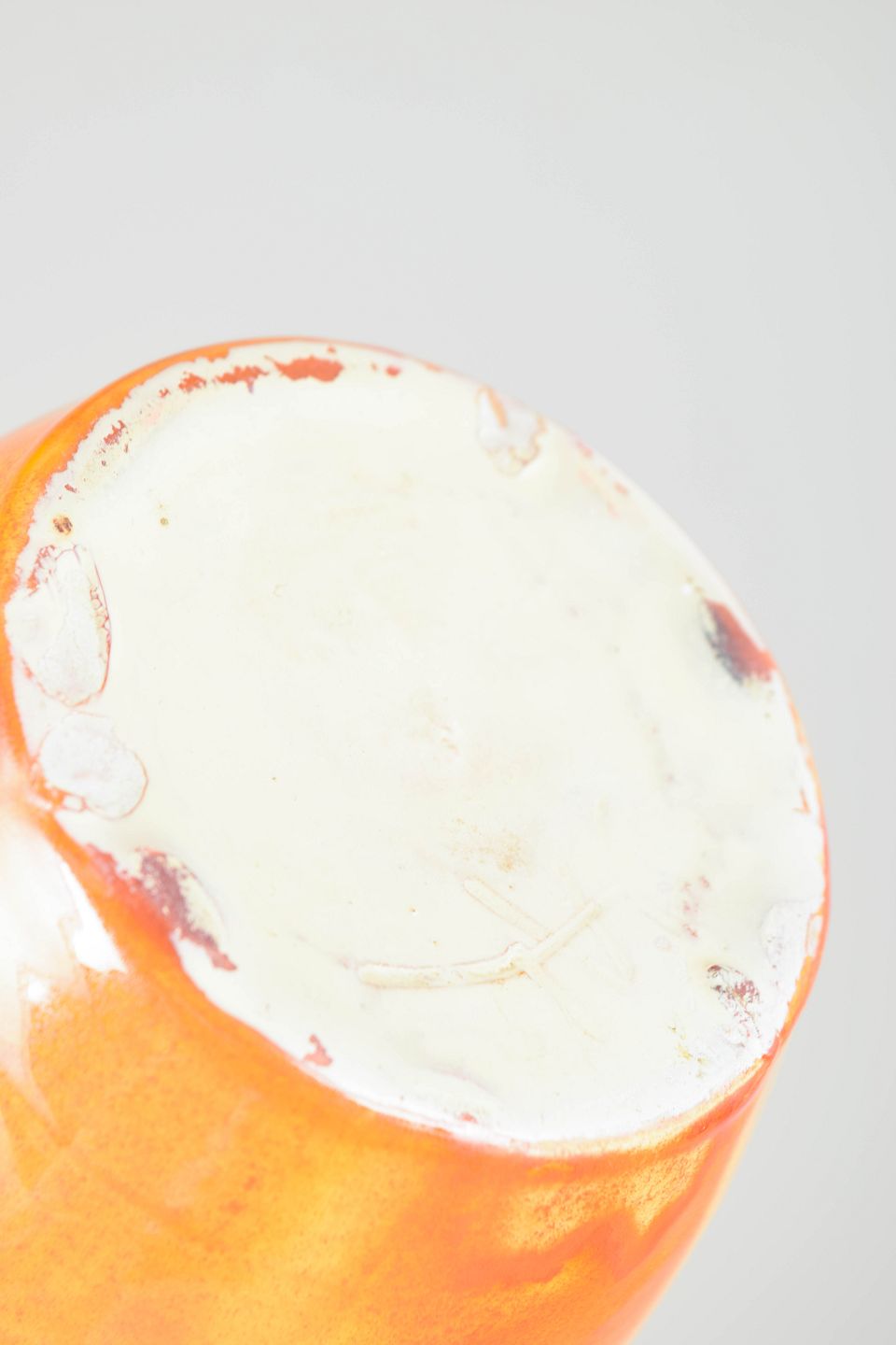 Elegant vase in glazed earthenware with a softly tapering form and slightly flared rim. Executed in a light yellow glaze with warm orange tones and fine vertical runs creating a lively and organic surface. Signed HAK to the base.