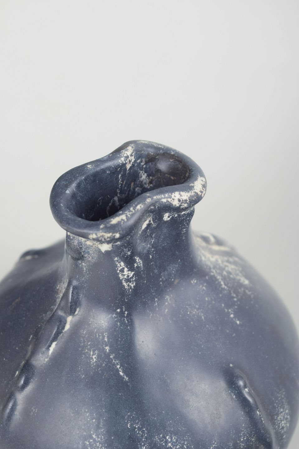 Compact vase in glazed earthenware with a rounded body and characteristic wavy rim. Executed in a double glaze in dark grey and black tones with a subtle metallic sheen and lively surface variation.