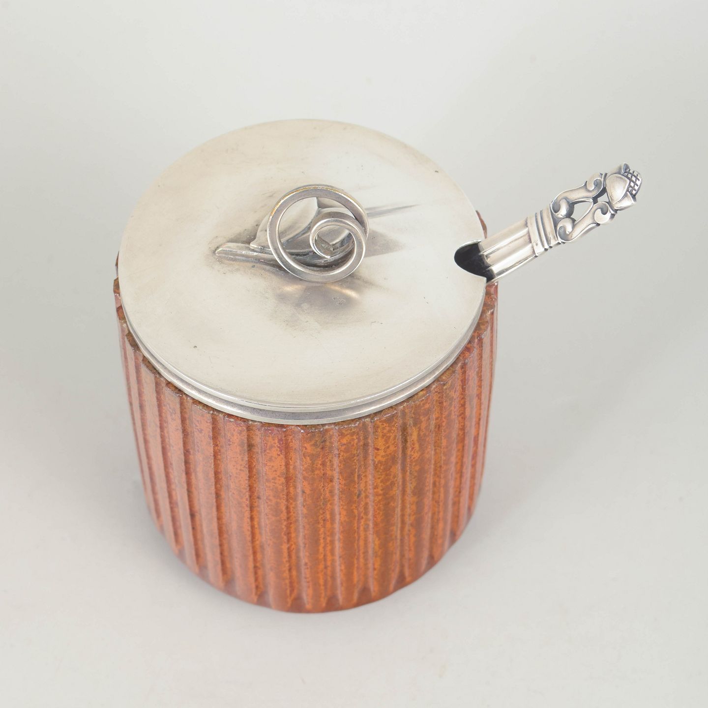 Hand-thrown cylindrical stoneware jar, model number 129, with vertically fluted body and a warm reddish-brown glaze with lively surface variation. Fitted with a lid and a Georg Jensen spoon in the Acorn pattern, produced in the 1940s in a refined Art Deco style.