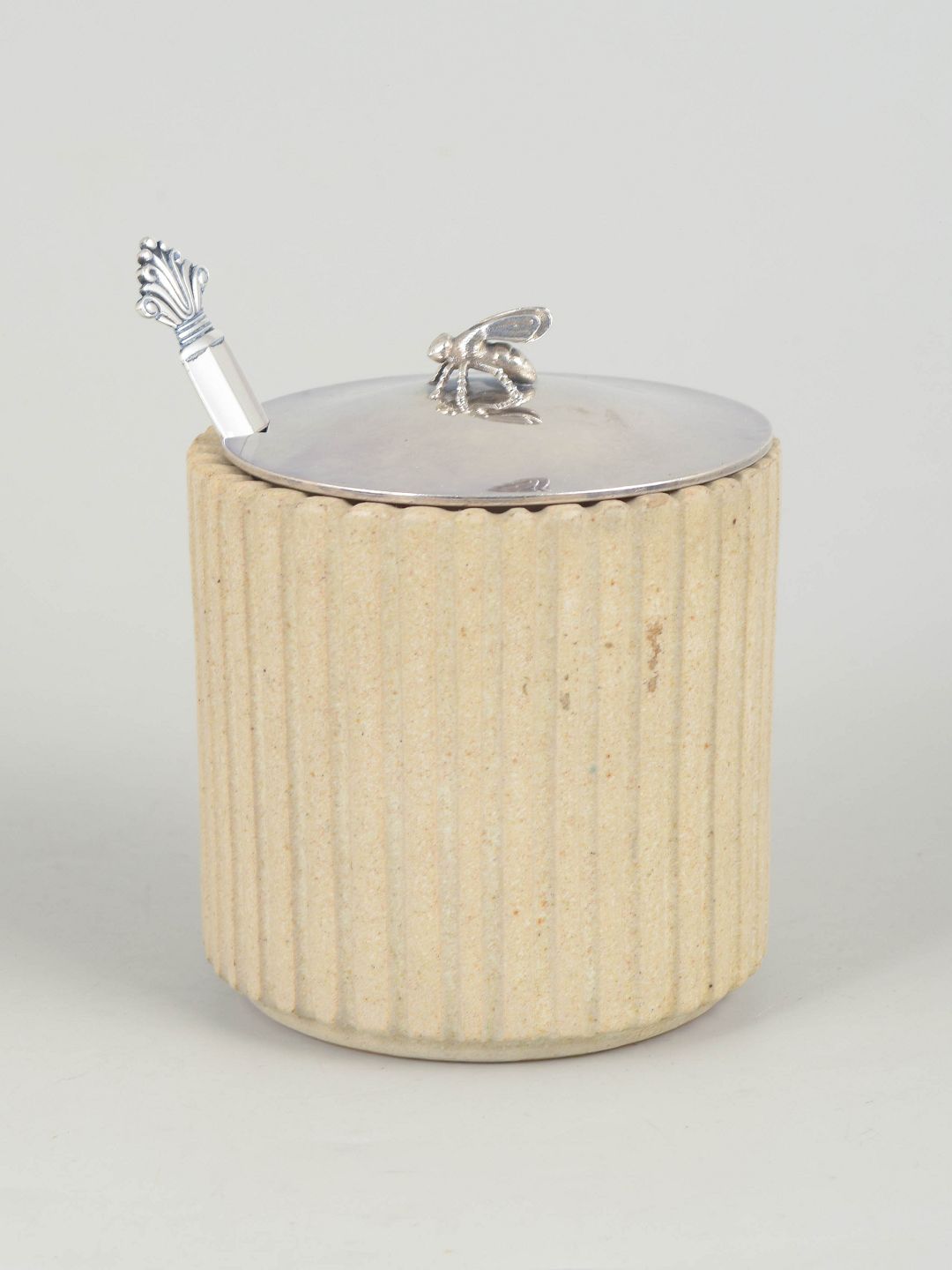 Hand-thrown cylindrical stoneware jar with vertically fluted body and a light matte glaze. Fitted with a sterling silver lid and spoon from Georg Jensen, in the classic Acanthus pattern, produced in the 1940s.