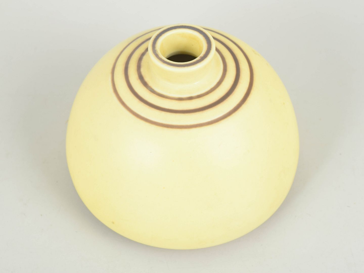 Rare and early stoneware vase with a soft organic form and delicate pale yellow glaze, accented by fine concentric bands at the neck. Signed to the base with Gustavsberg mark and incised monogram.