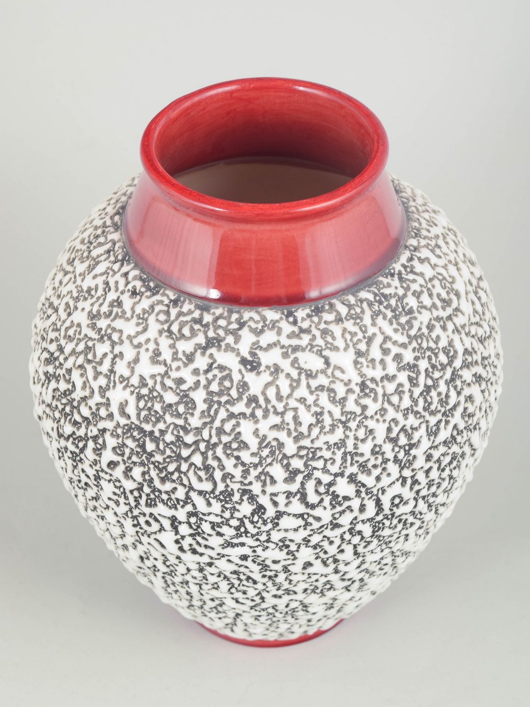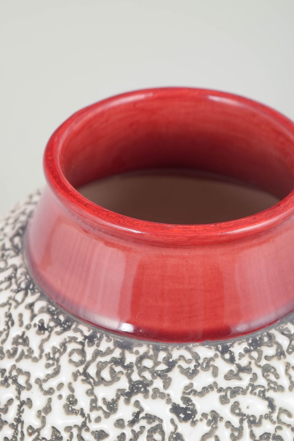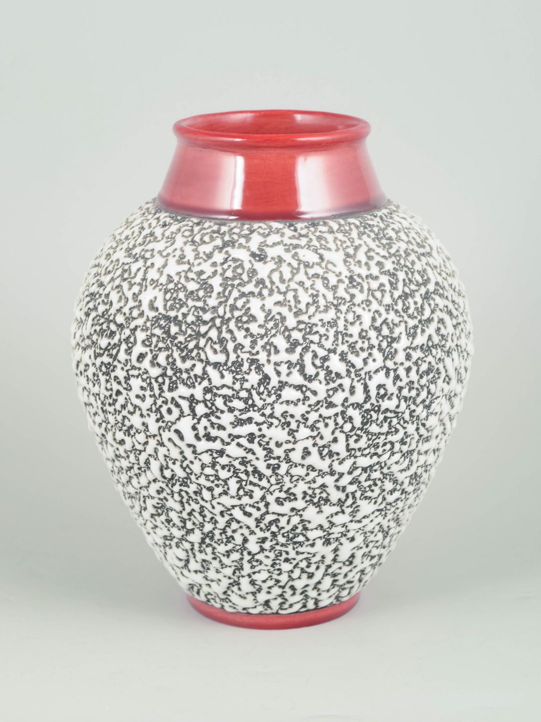 Art Deco ceramic vase of baluster form, decorated with a dense black abstract pattern on a white ground, with pink-red glazed neck and foot. Signed.