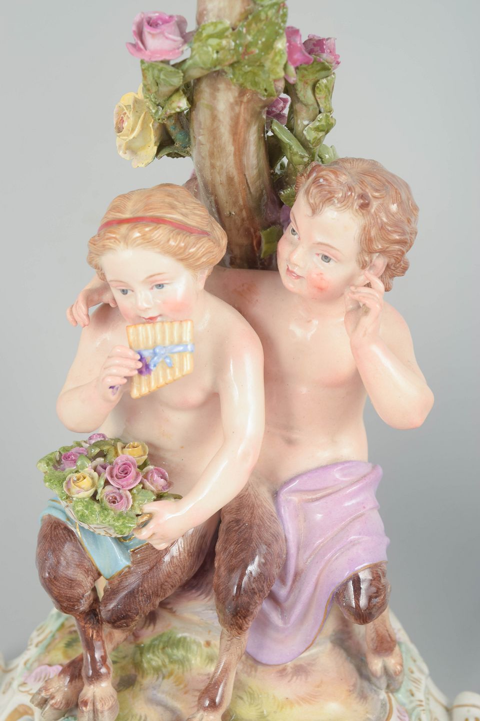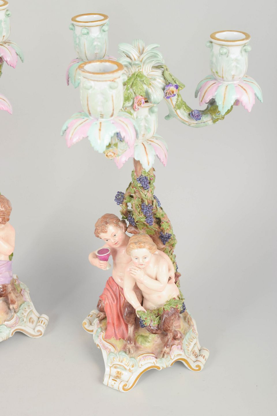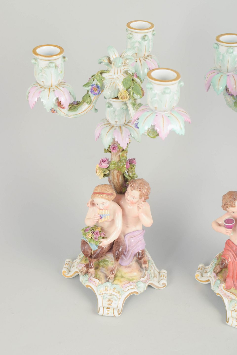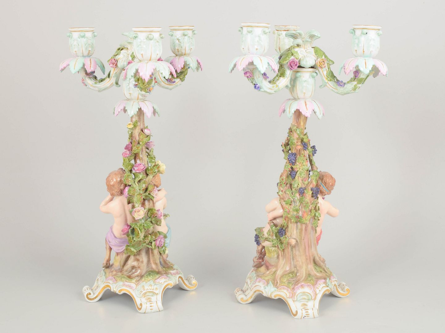 Impressive and richly modelled porcelain candlesticks with three arms, designed with a naturalistic tree trunk, floral decoration and figural groups featuring putti and satyrs in polychrome glaze. Marked underneath with the Meissen crossed swords.