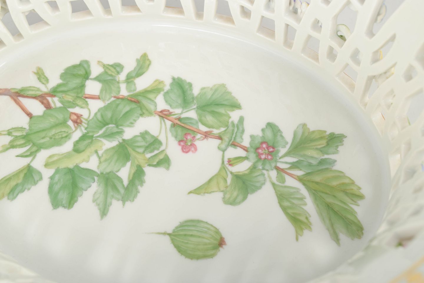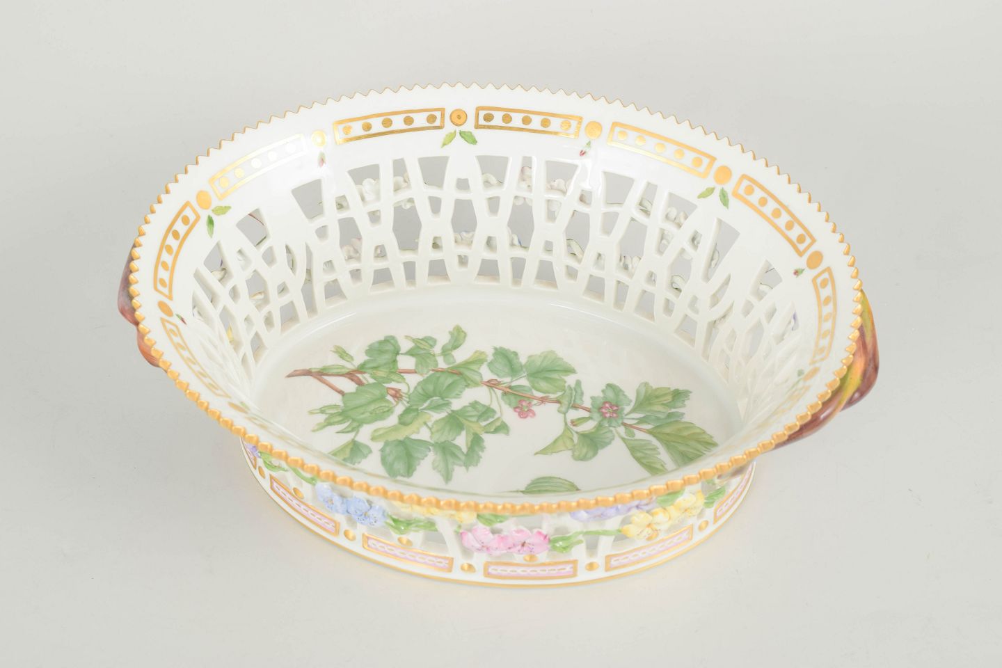 Open reticulated basket with pierced body and hand-painted botanical decoration from the Flora Danica series. Executed in porcelain with fine detailing and gilding. Model 20/3536, 1st factory quality, dated 1964.