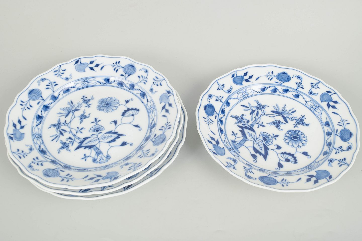 Four porcelain dinner plates with hand-painted blue decoration in the classic Blue Onion pattern. First factory quality, marked with Meissen crossed swords. Diameter 24 cm.