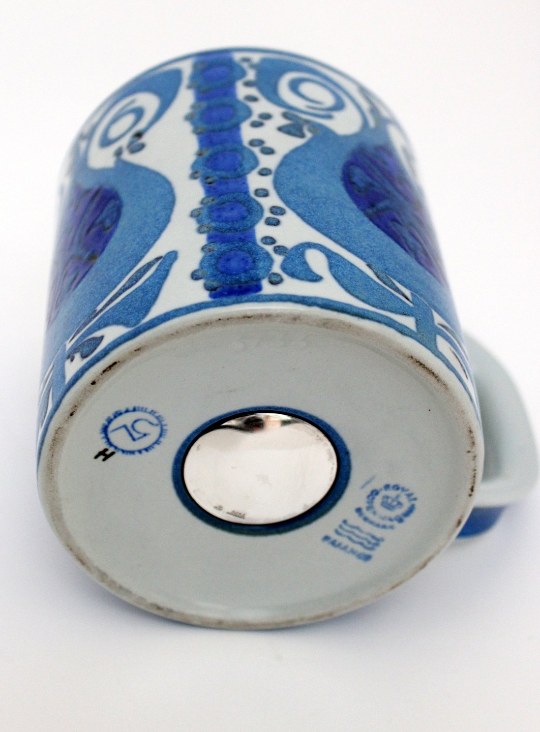 Text available in Danish: Royal Copenhagen, fajance, Stort årskrus 1969 med 925 sterlingsølv plaquette i bund. Kunstner Nils Thorson. Nr. 3135. Årskrusene er produceret fra 1967 og frem til 2014. Højde 11,5 cm. Diameter 10,5 cm. I. sortering. Flot stand. Pris: 500 kr. stk. Lager: 1
