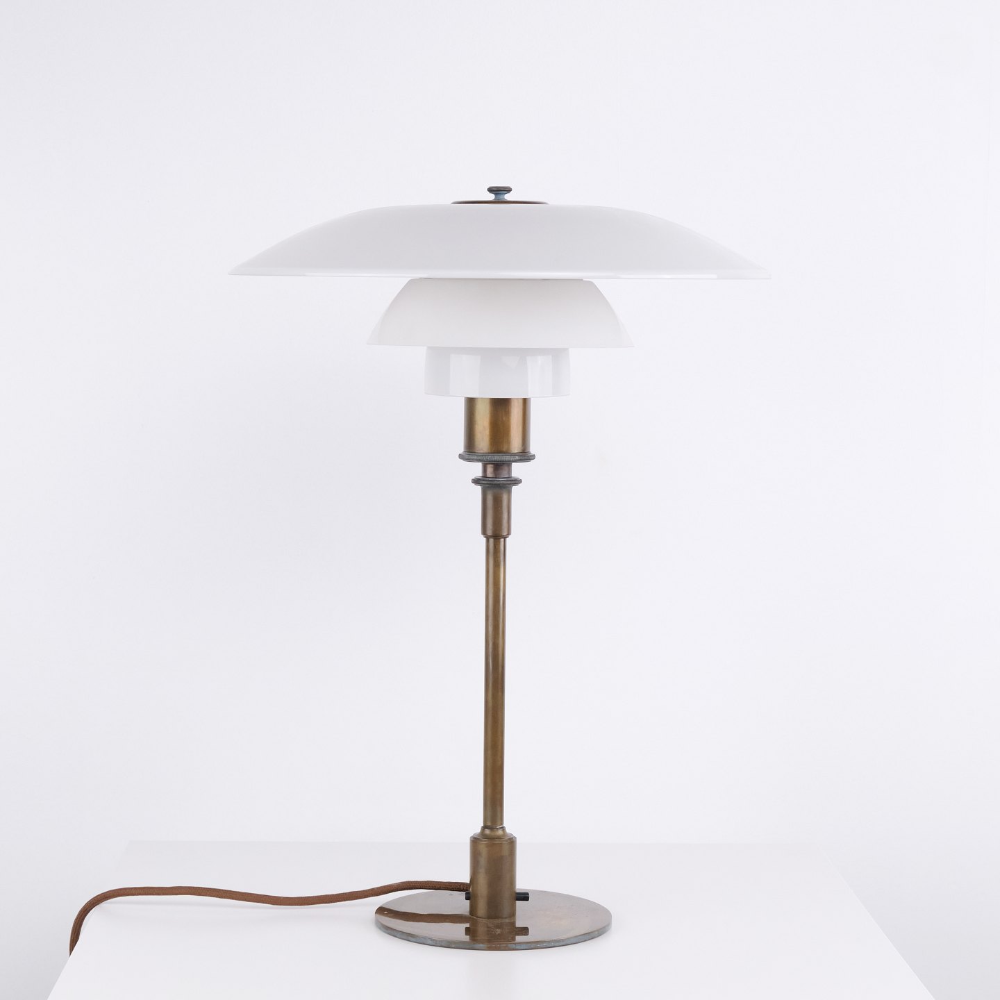 PH 4/3 table lamp designed by Poul Henningsen and produced by Louis Poulsen in the 1930s. The lamp is made of burnished brass with white opal glass shades, providing a soft and diffused light.