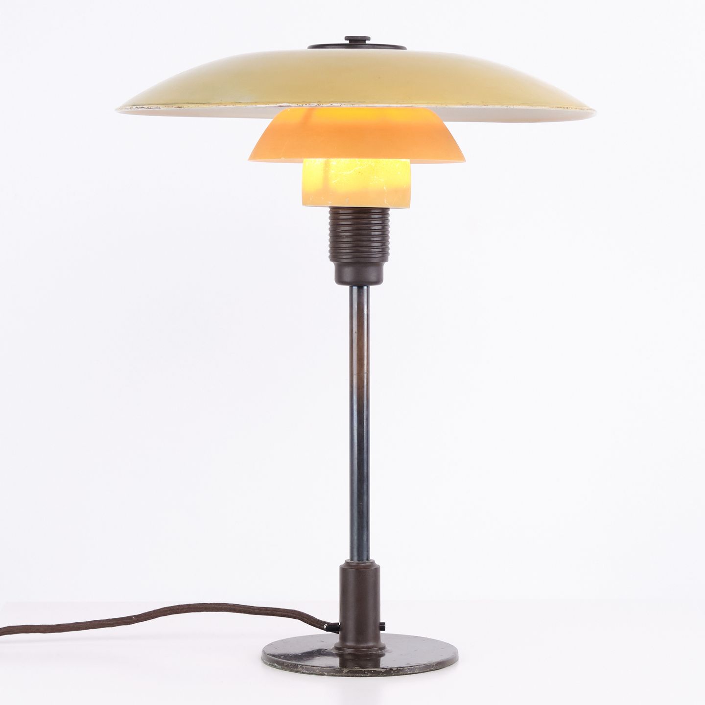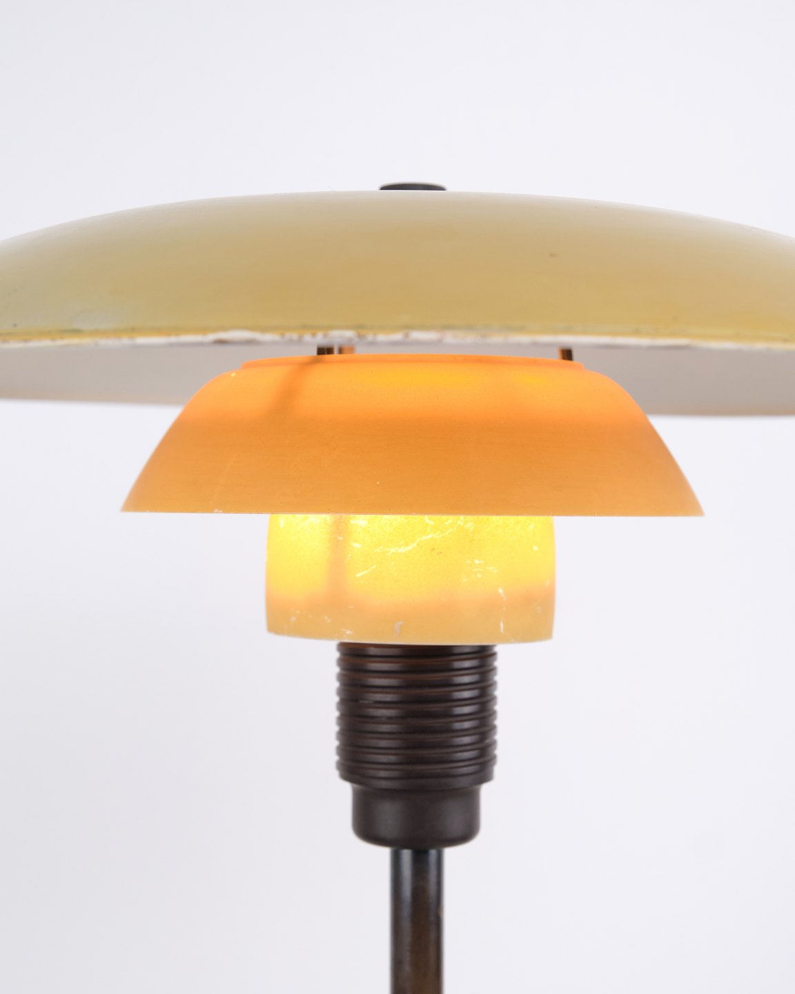 PH 3½/2½ table lamp designed by Poul Henningsen and manufactured by Louis Poulsen in the 1930s. The lamp features a yellow metal top shade with middle and lower shades in yellow-painted opal glass, creating a warm and distinctive light. The combination of materials and colours highlights the lamp’s functional and decorative character.