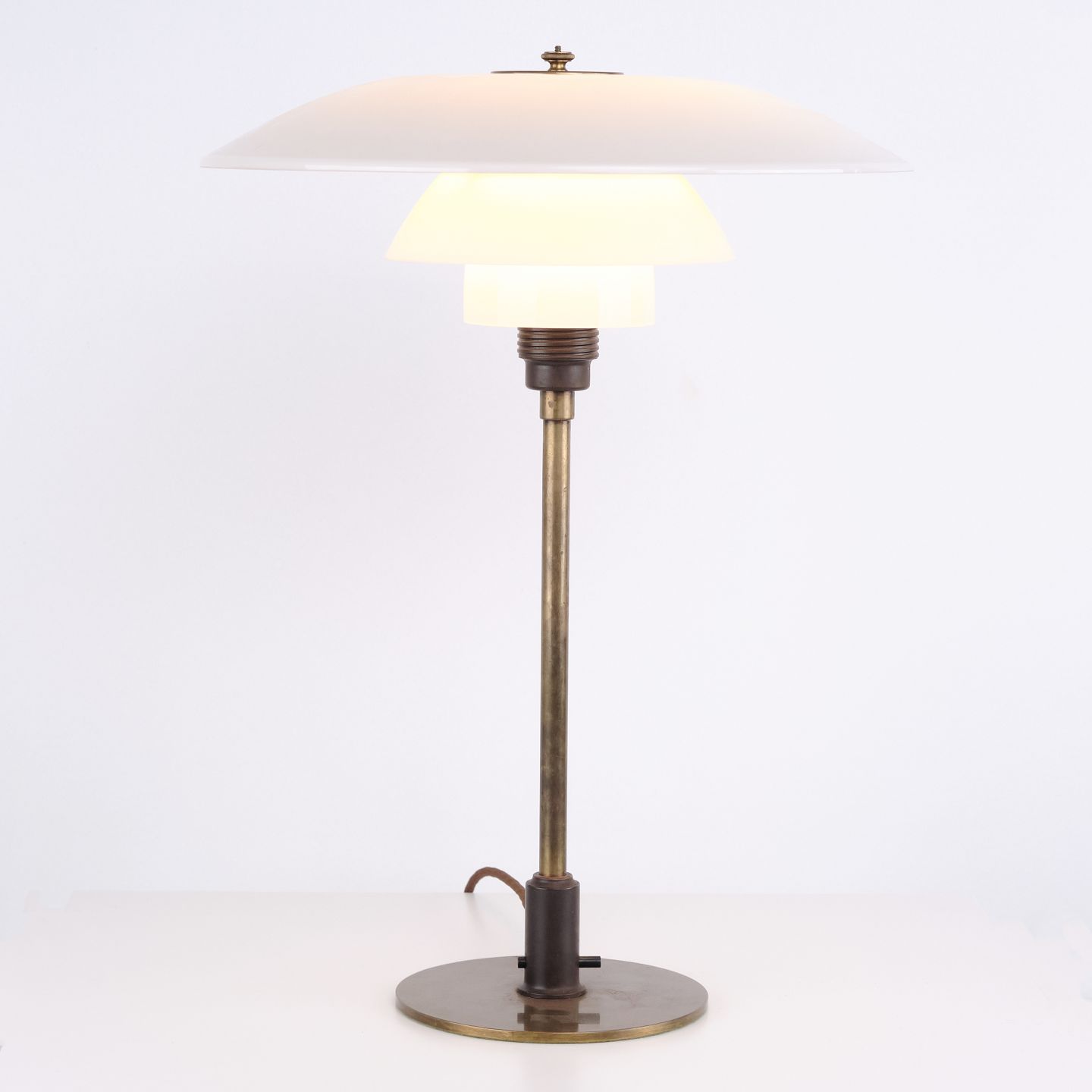 PH 4/3 table lamp in burnished brass with opal glass from Louis Poulsen, 1930s. Marked “Patented” and designed by Poul Henningsen.