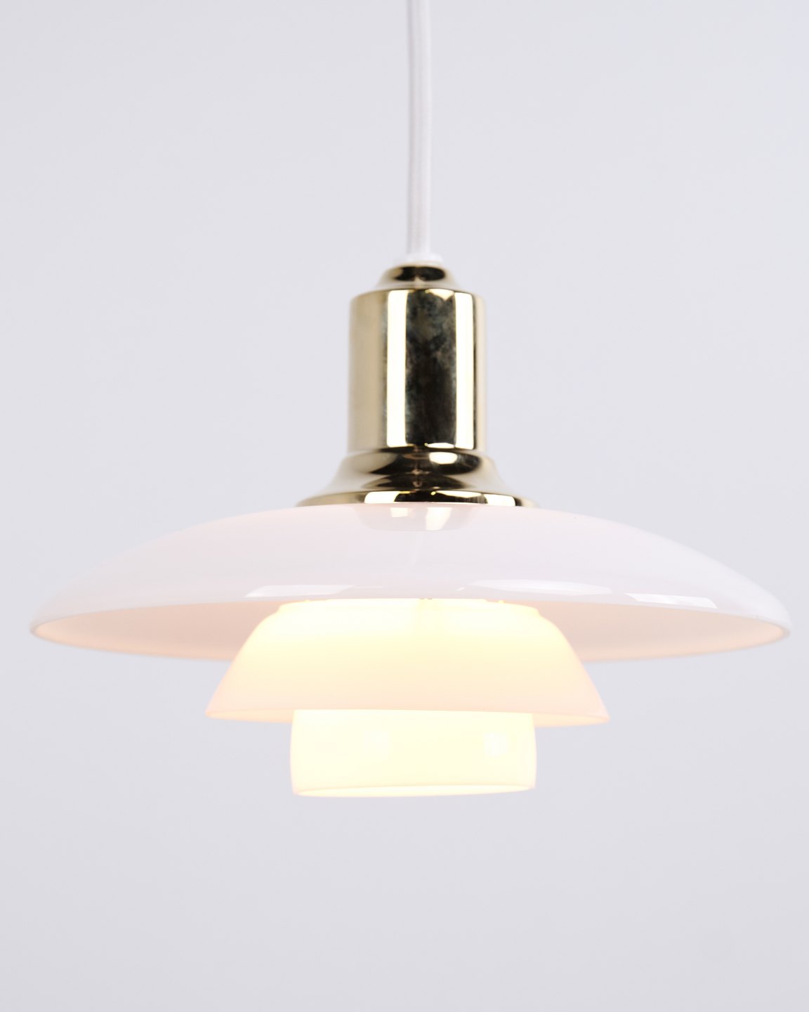 PH 2/1 pendant in brass with opal glass from Louis Poulsen. Designed by Poul Henningsen with classic Danish lighting design and glare-free illumination.