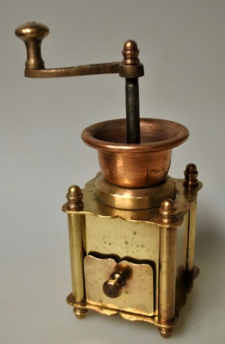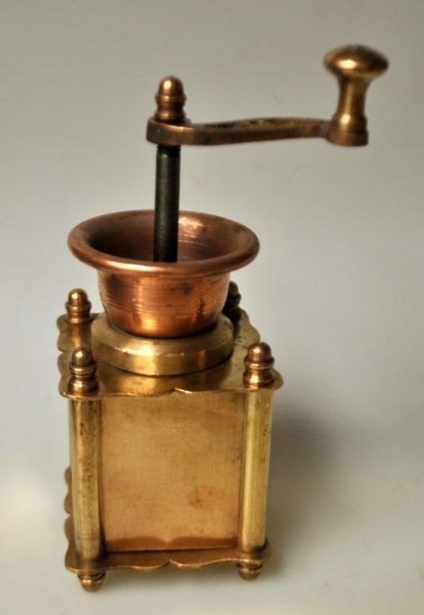Small antique coffee grinder in brass/copper, 19th century. Denmark.
