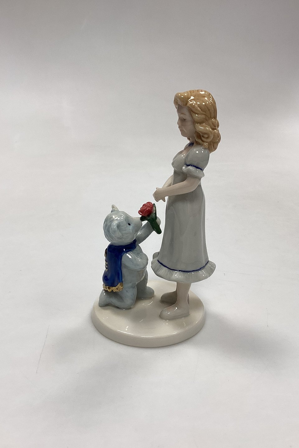 Royal Copenhagen Figurine - Snowwhite Rosered. Motif from the fairy tale Snowwhite and Rosered with a wooing Steiff Teddy Bear. Collaboration between the two companies with the inscription: Snowwhite Rosered Steiff / Button in ear.
